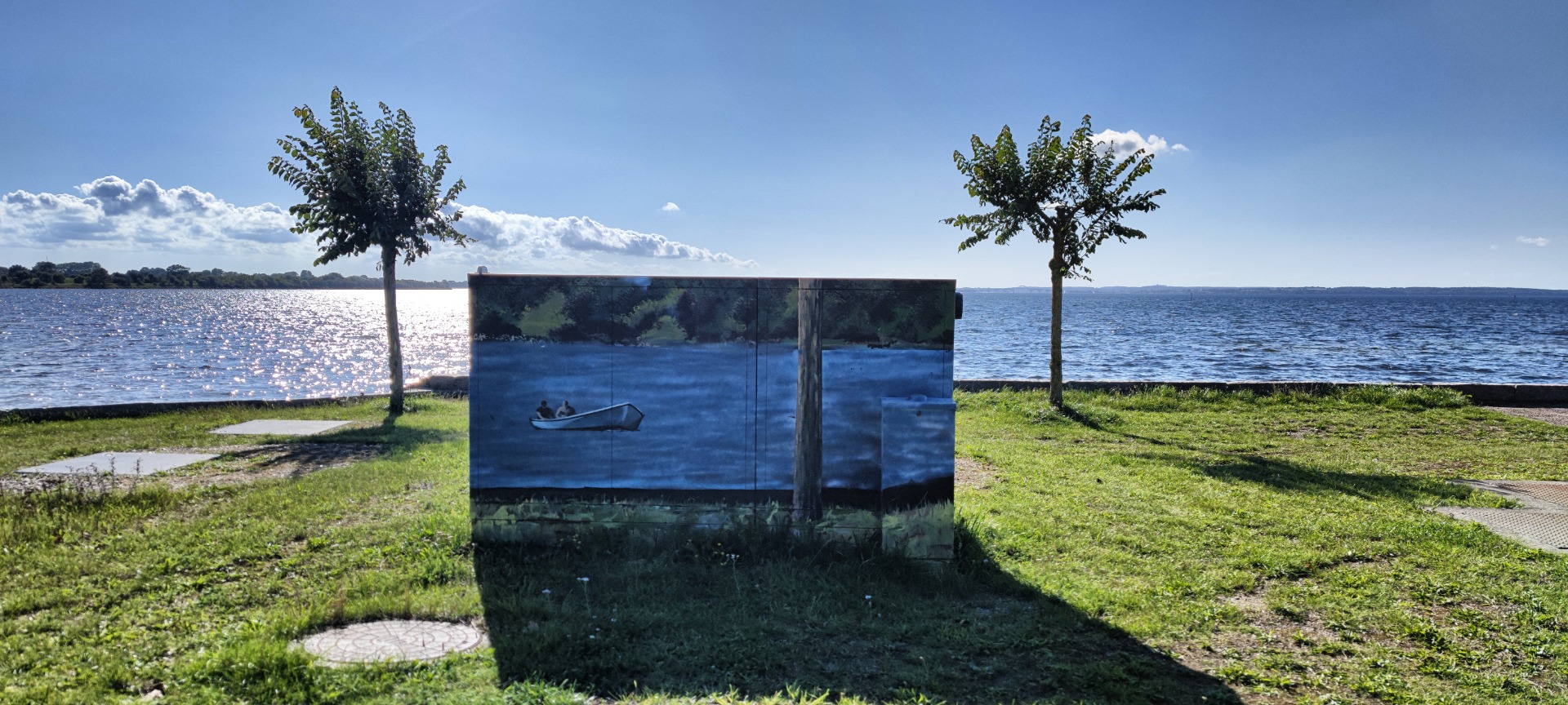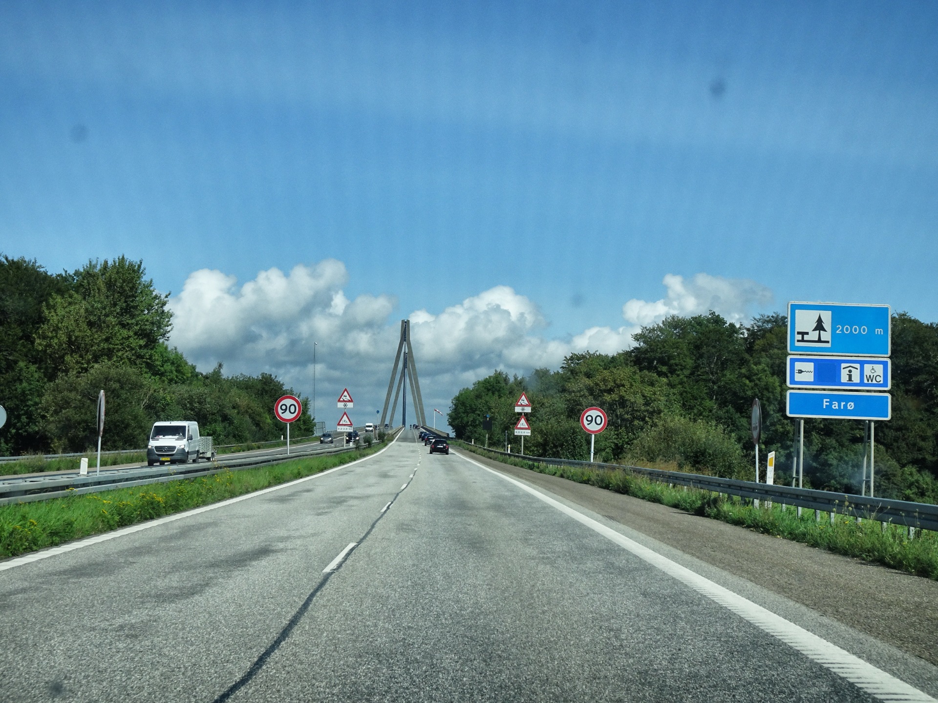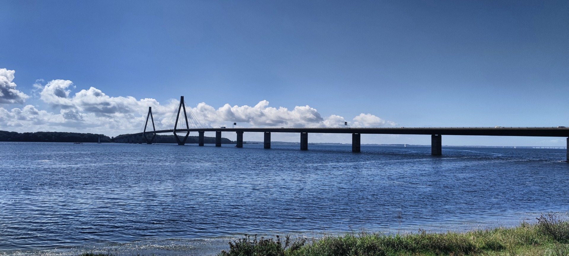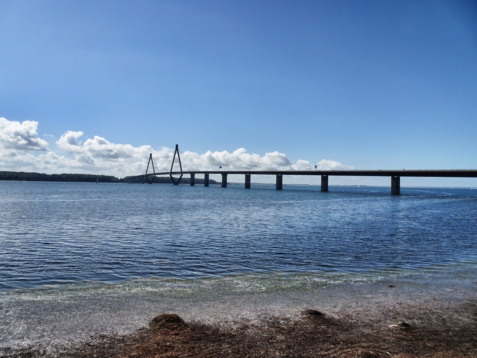 First comes a bridge, then another. One is enormous, a marvel of technology. But there is only a small bridge leading over to Mon, long but flat. On the right there are birds in the water, on the left an angler is waiting for a catch.