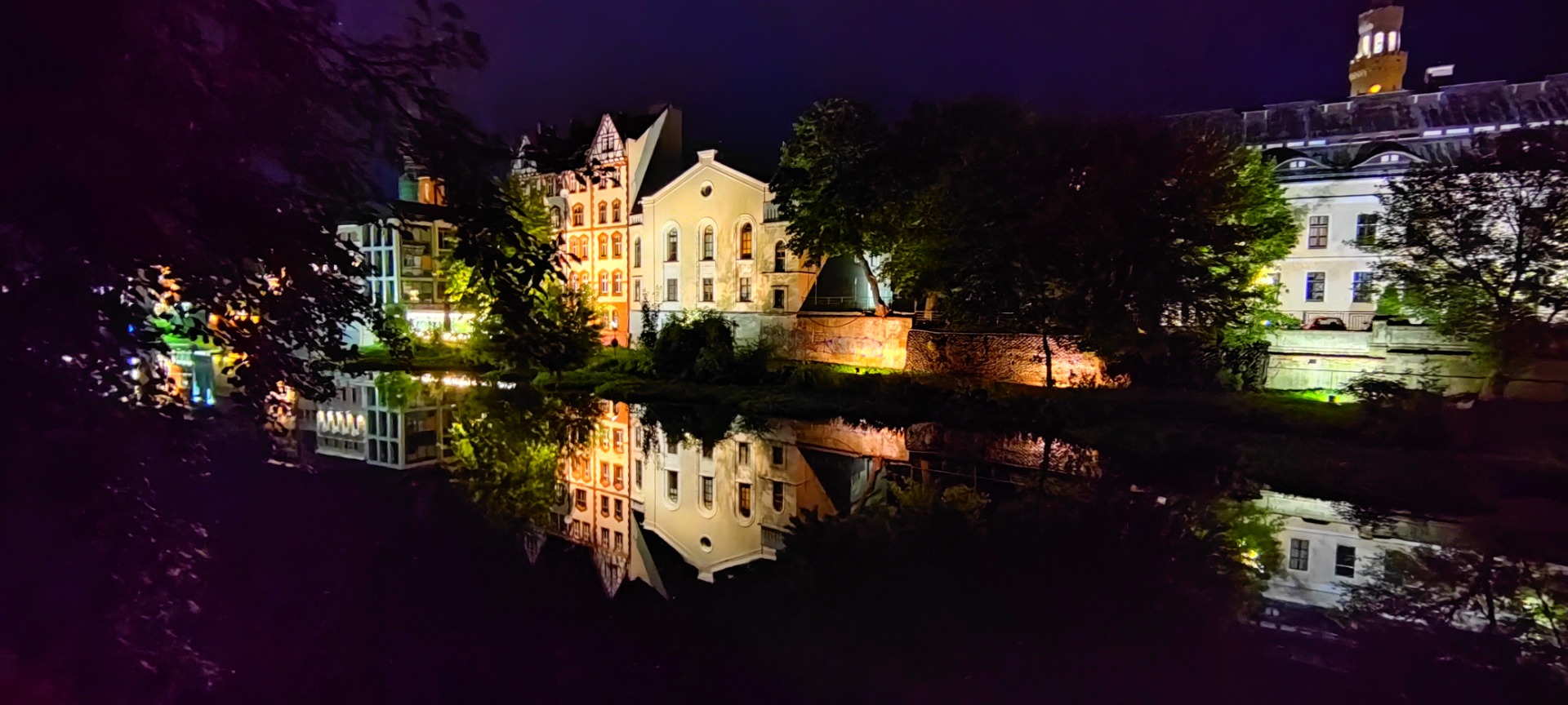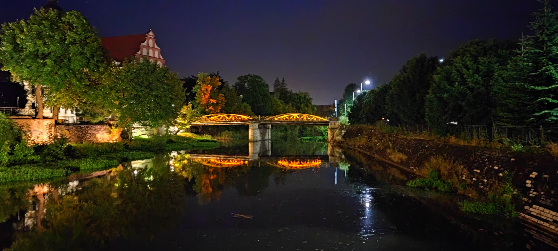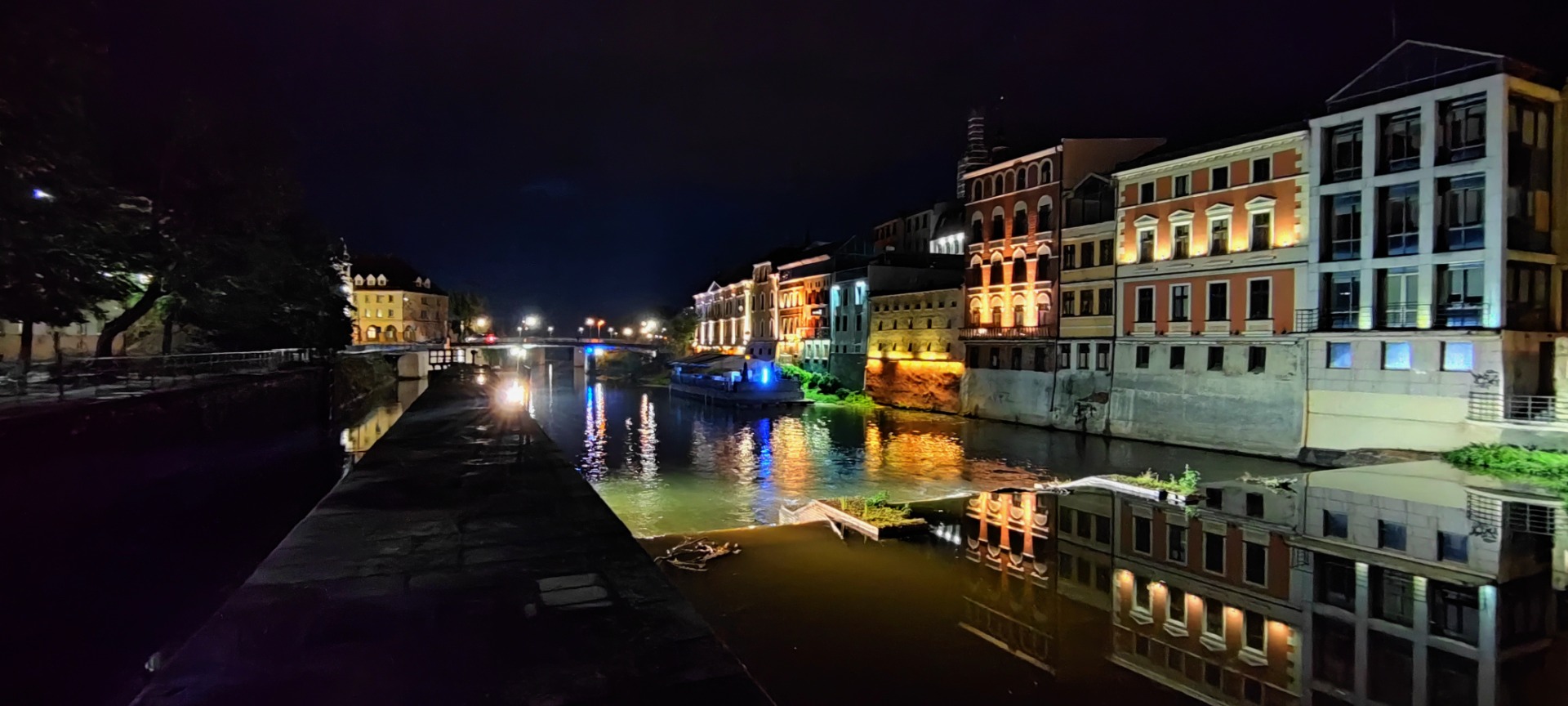 Between countless churches and wonderful parks. On one side of the Oder or on the other. It is quiet. It is peaceful and when the sun goes down, the small town transforms into a magical backdrop for colorful lights that shine on the water of the river.