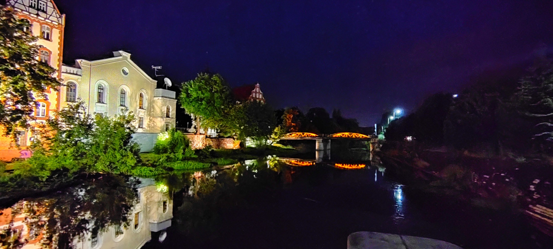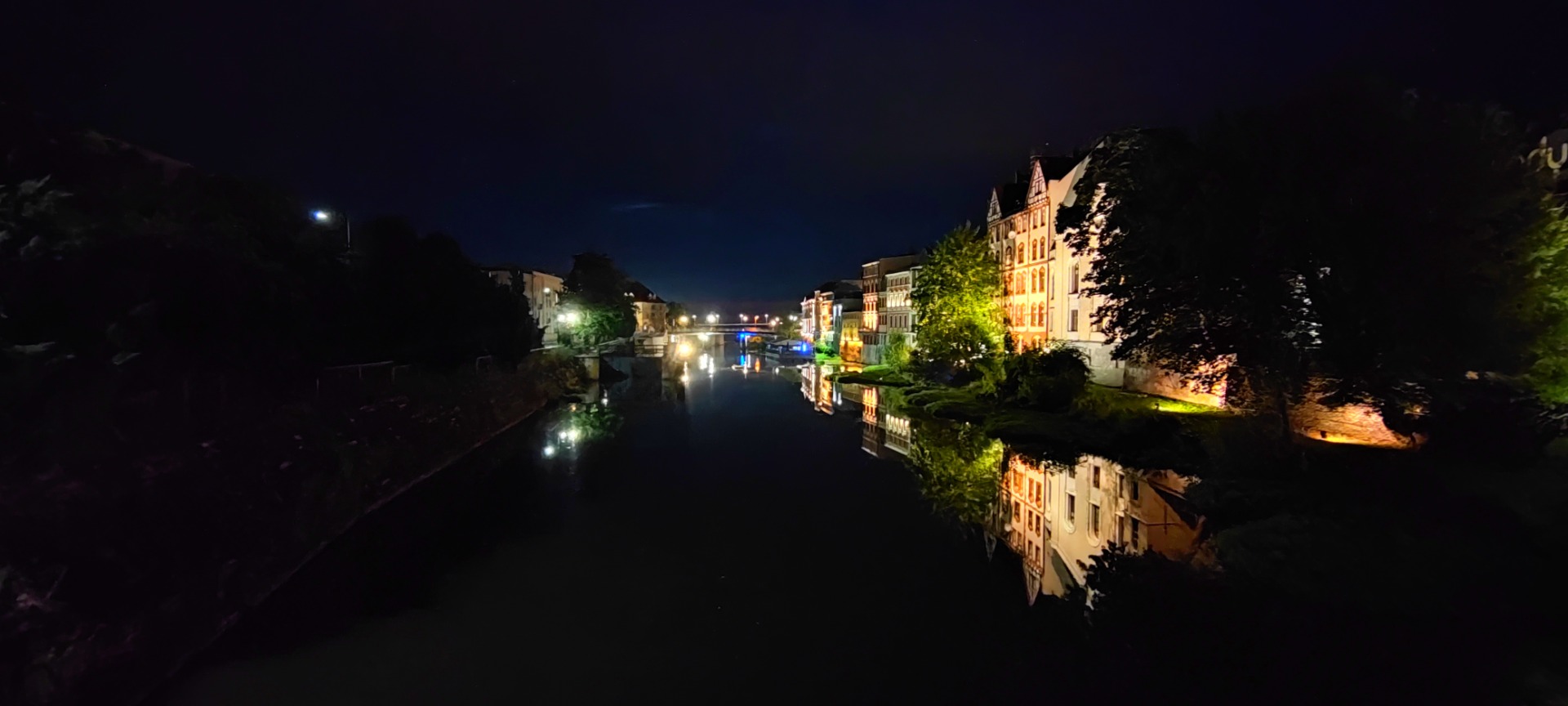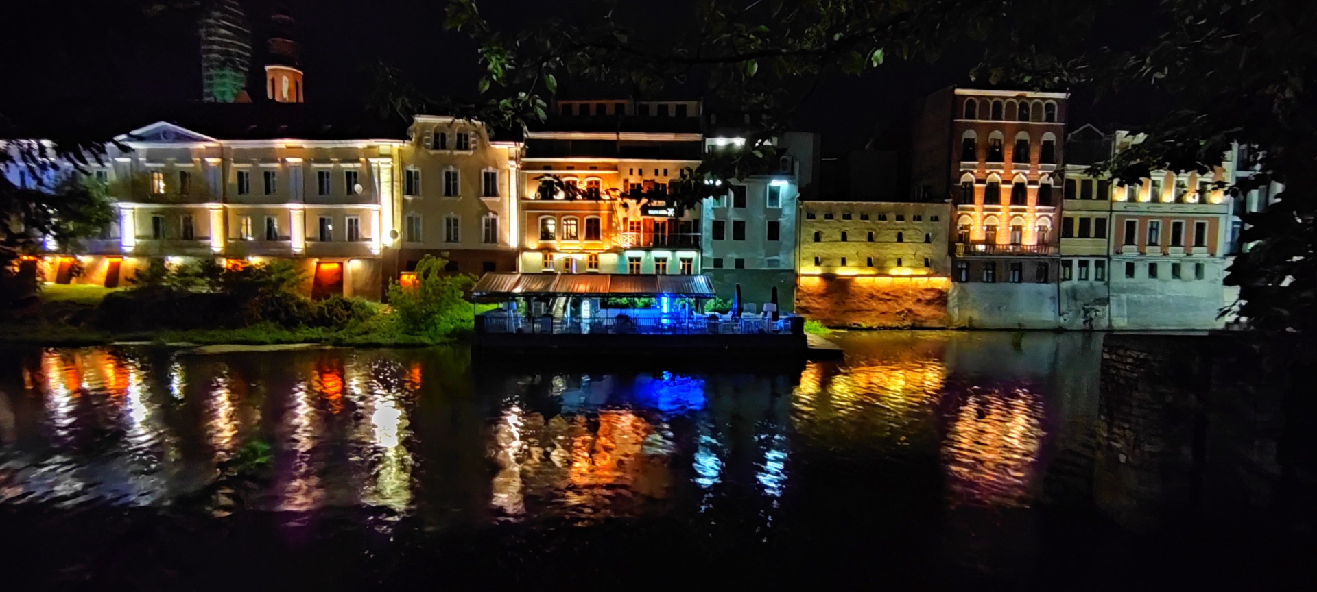 Between countless churches and wonderful parks. On one side of the Oder or on the other. It is quiet. It is peaceful and when the sun goes down, the small town transforms into a magical backdrop for colorful lights that shine on the water of the river.