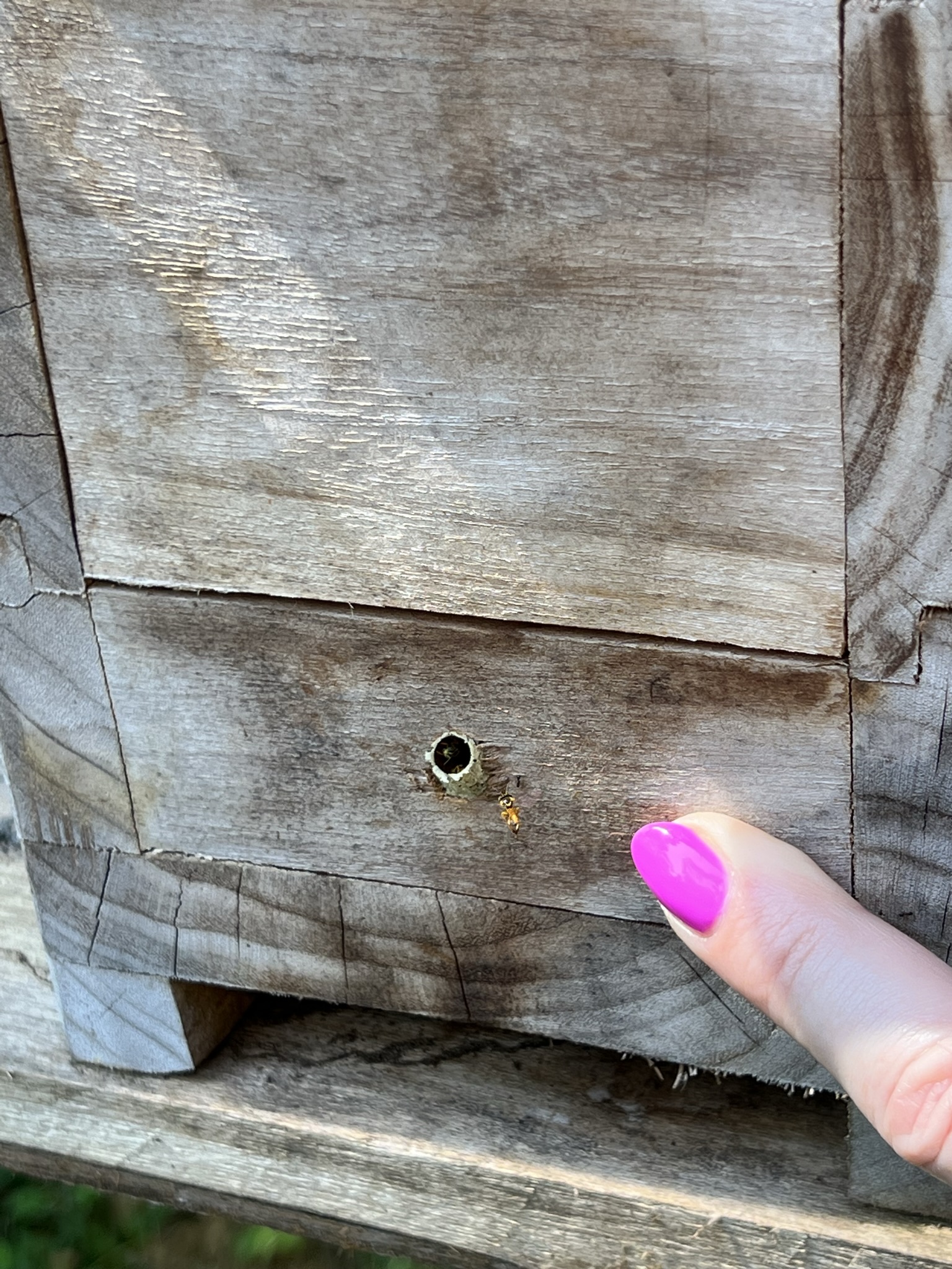 In this photo you can see the size of the bee living in the hives because I put my finger on it and you can see that the bee is half the size of my fingernail.
