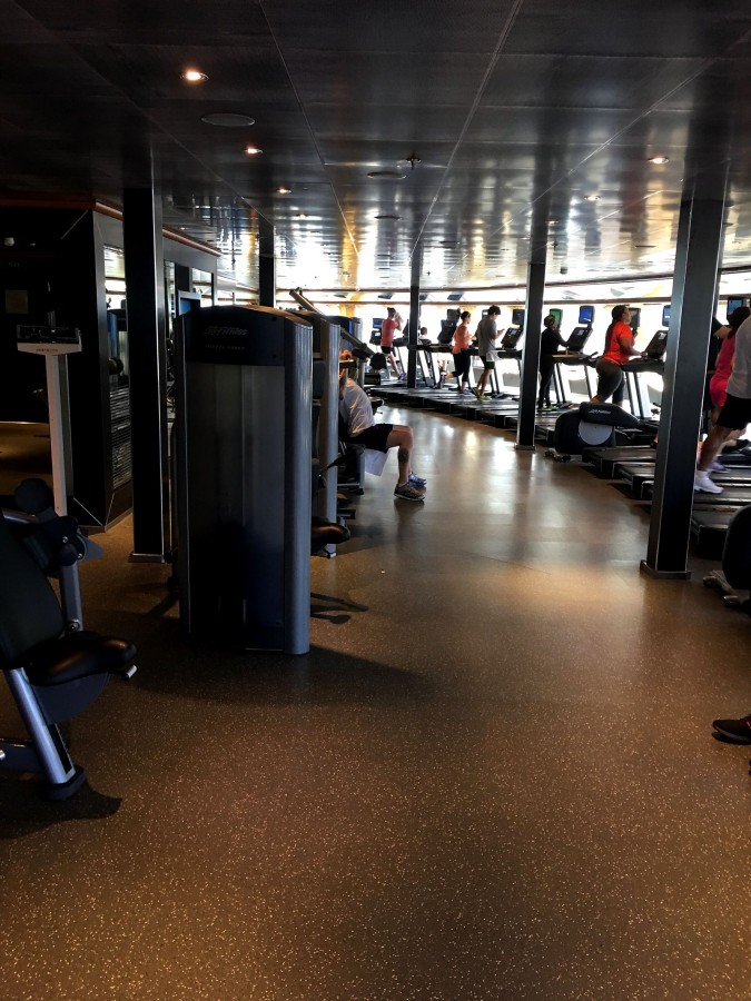 The first night we went to the gym. Rather, the evening was already the second, and the first day of the cruise, the one at sea. You run on a treadmill and look at the ocean. Very impressive. But you can also look at the monitor of the treadmill, there are different advertisements. 😉