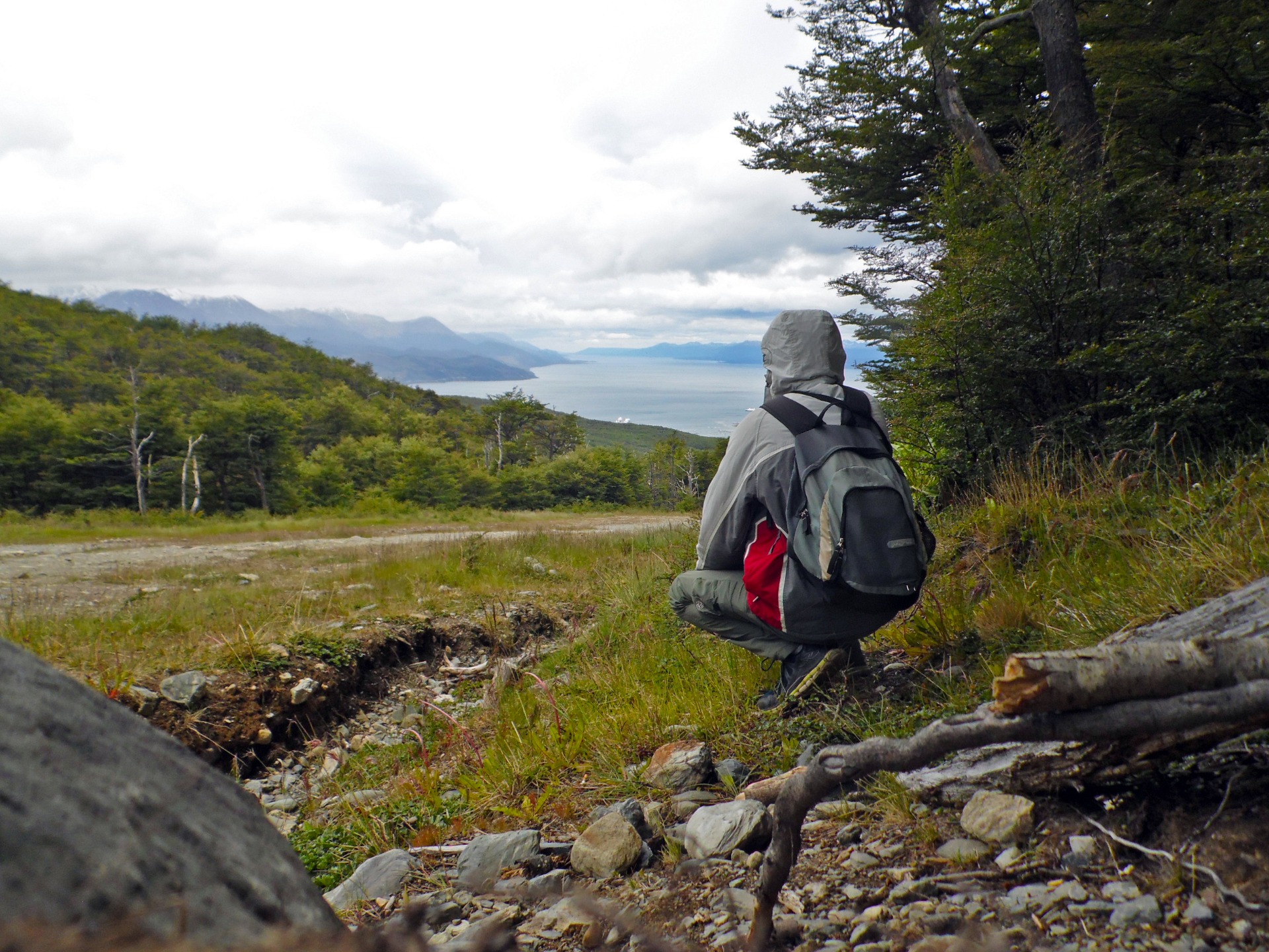 On that day I decided to see for myself, from the top, the deep bay I had just heard of from researching on the internet while sitting on a bench overlooking the Beagle canal. Luckily, I met with Vadim, my russian friend, and we both decided to walk up the Cerro Martial together, a path that cuts through a poorer area of the highly touristic city and ends in a steep climb with some flat loose stones amid long straight trees and along a freezing crystal clear river that runs down the mountain from the glaciar above.