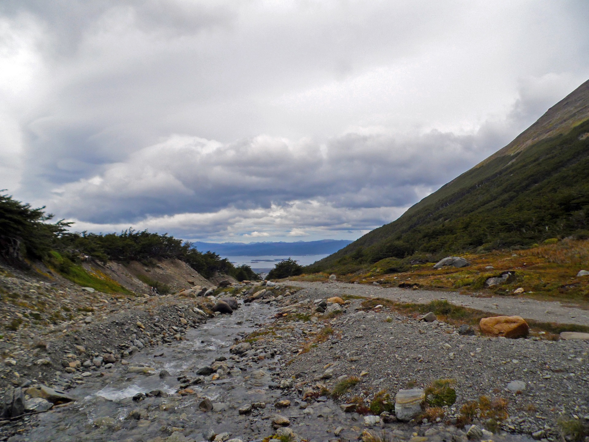 The cerro Martial is one of the hills behind the city, it is sided by Mount Olivia and both overlook the Ushuaia Bay, where the city is nestled at the northern limit of the Beagle Channel. The view from the top of cerro Martial was particularly unique as the landscape funneled amid two hills where the stream runned down, and culminated with an astonishing third plan view from the Ushuaia Bay with all the boats anchored on the Beagle channel. Further back sparse islands followed the channel and I knew that behind it all laid the fearsome Cape Horn, avoided by every sane navigator in existence.