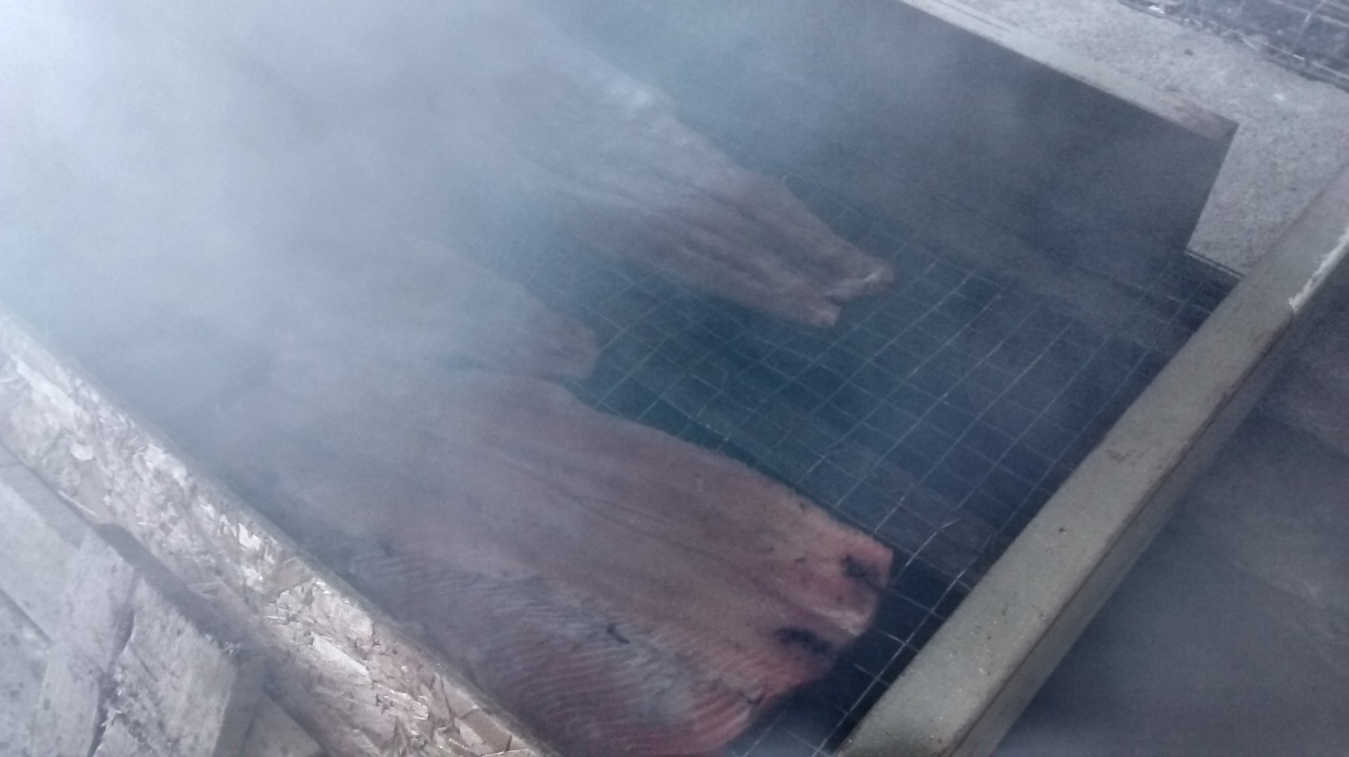 We entered a twisted wooden shed, where smoke partially filled the air. Nicolas proceeded to move some boards from the top of a metal foil placing them carefully against the wall. When he lifted the cover it revealed a hole from where wood slightly burned laid on the bottom; it was a Salmon smoker and three long and wide pink Salmon fillets laid on a grill.