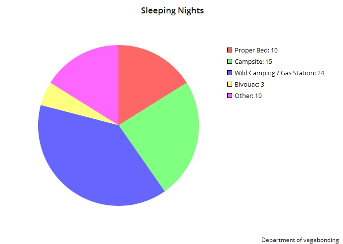 From 62 nights 52 I spent inside a tent or directly (3) sleeping on the ground in nature, a.k.a bivouac.