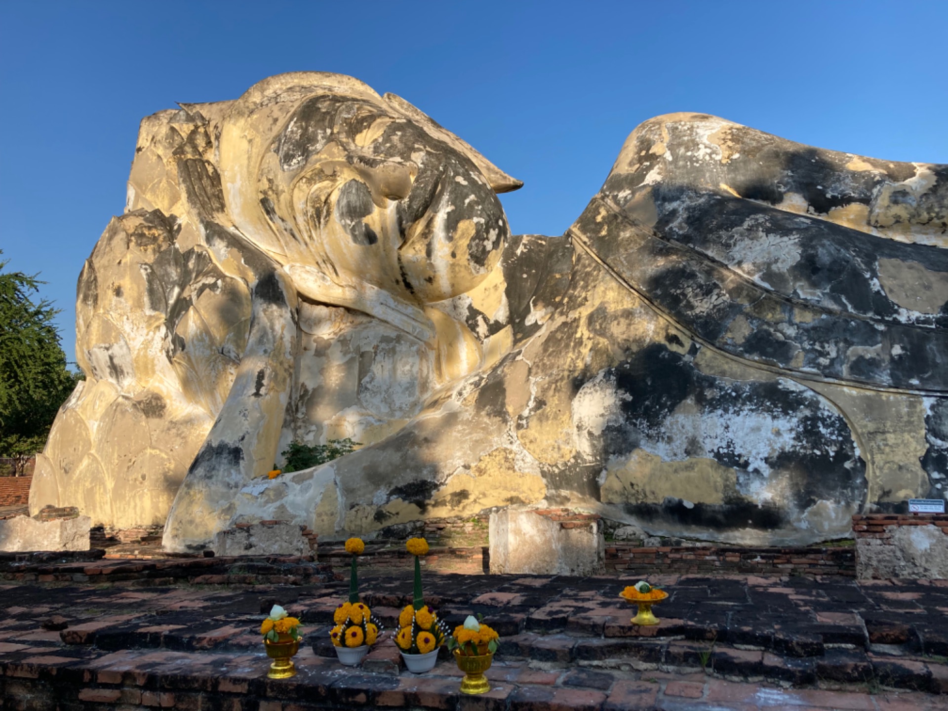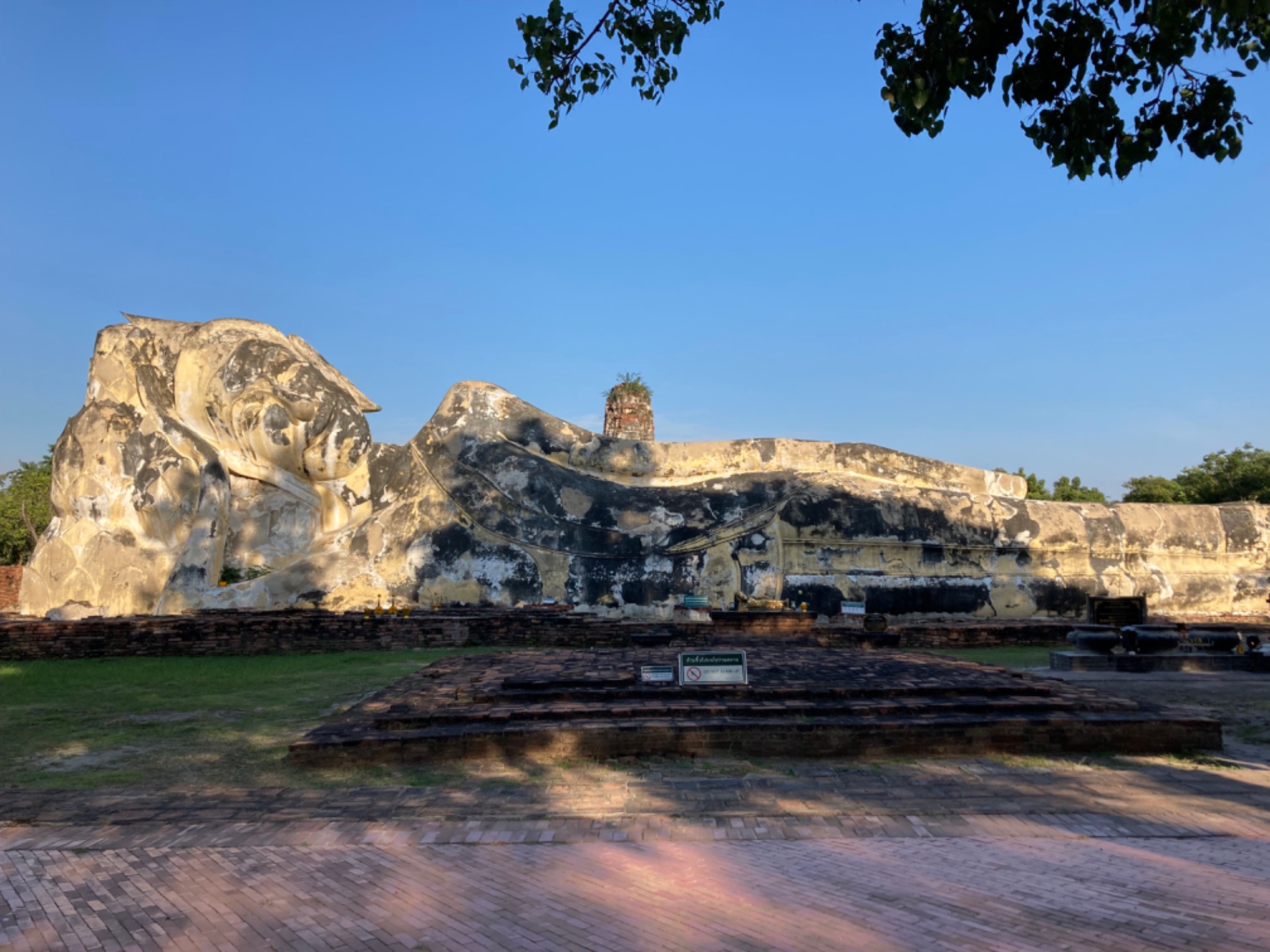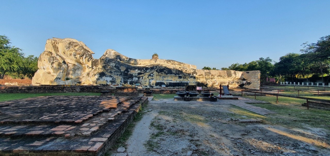 The largest reclining Buddha in Ayutthaya is here, 42 meters long and 8 meters high, majestically located outdoors. *Behind the Buddha image remain the ruins of an ordination hall or viharn. This temple is one of the highlights of the temples in Ayutthaya, attracting both Thai and foreign tourists. And for those who are interested in studying history and archaeology, there is no entrance fee for this temple. There is also free parking, but it is limited.