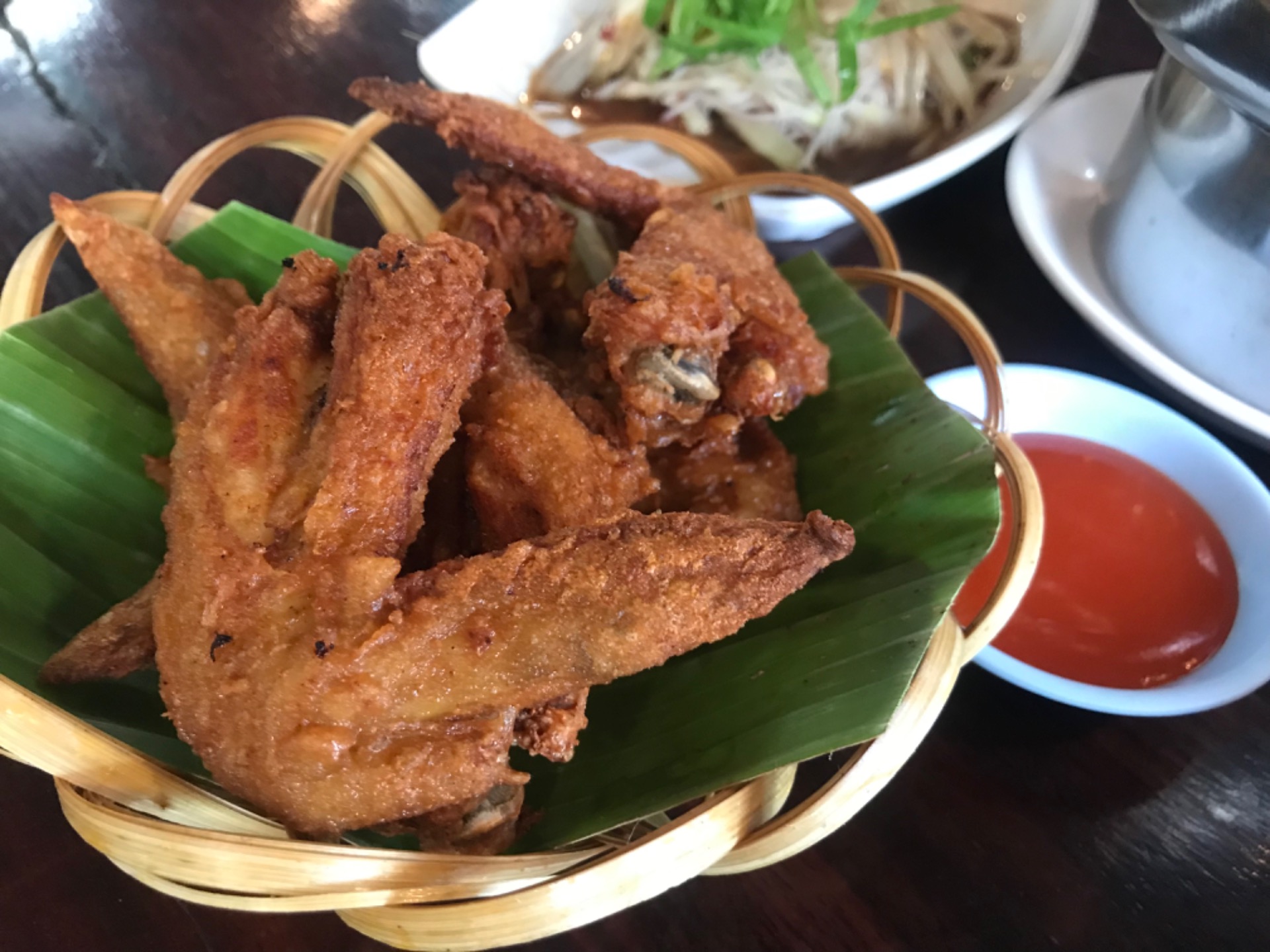 Crispy fried chicken wings, eaten with chili sauce.