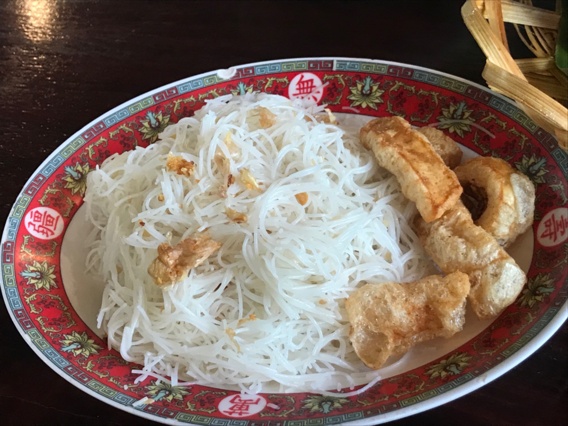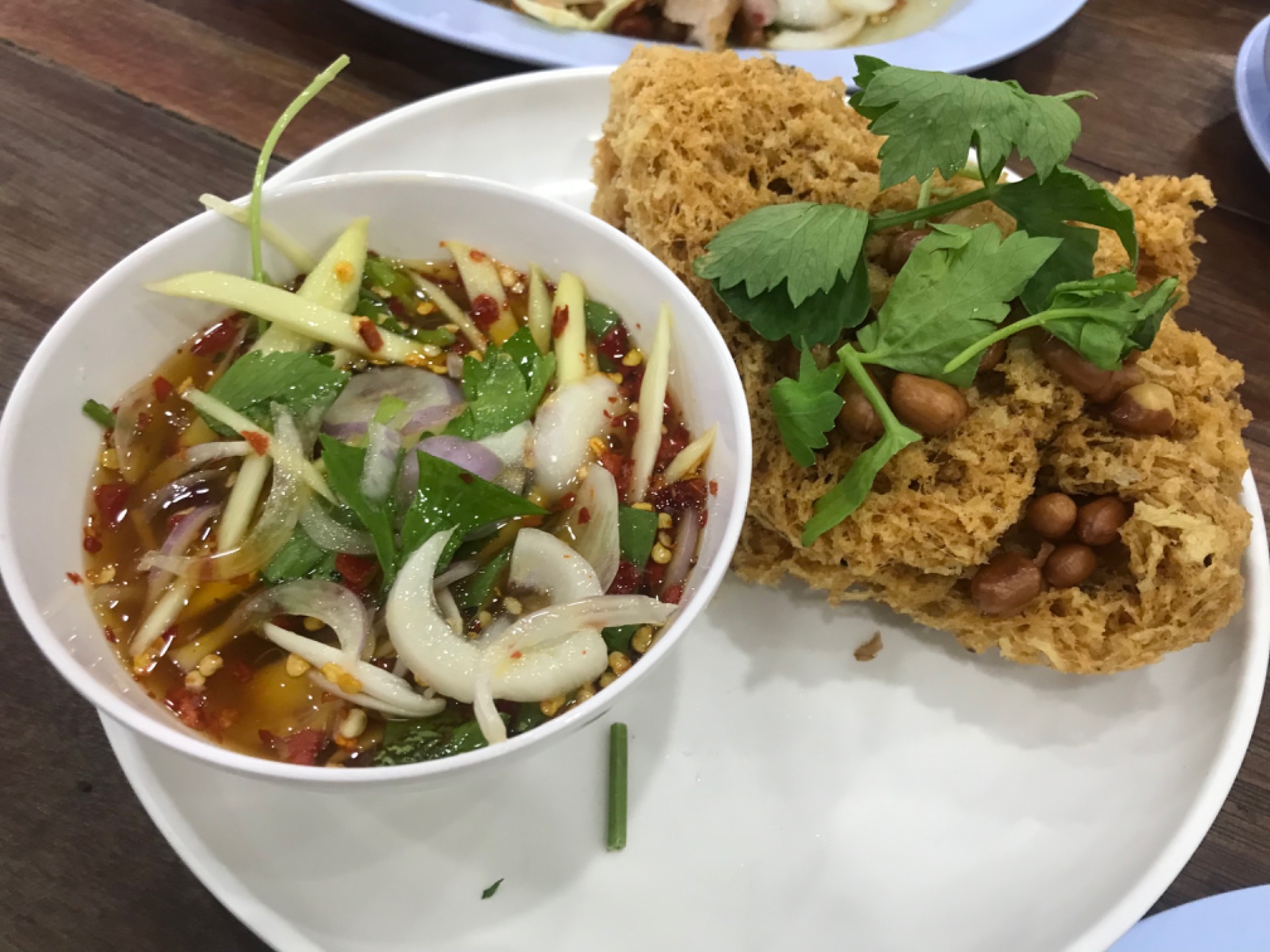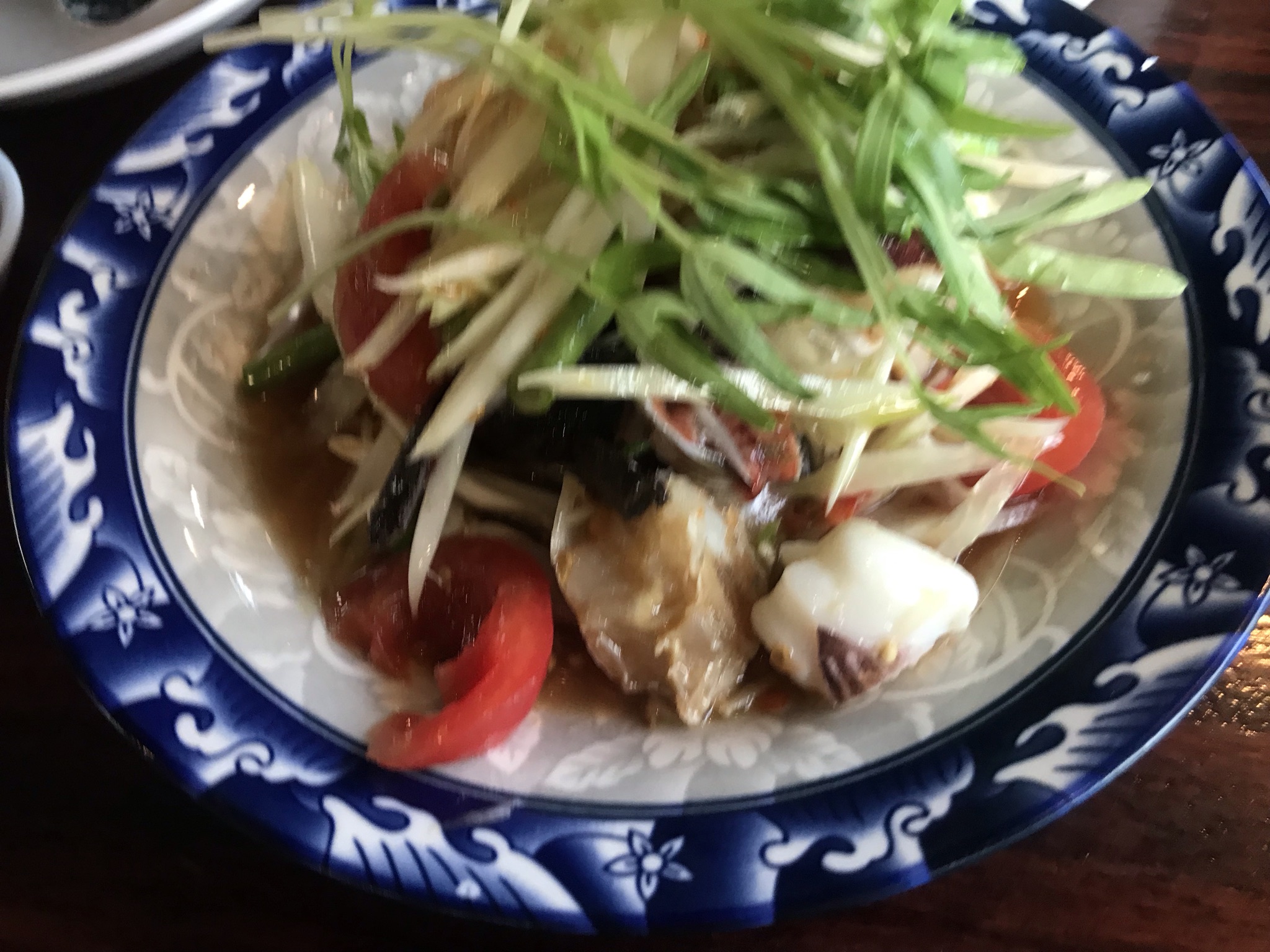 A medium spicy papaya salad with seafood and young morning glory on top. It was sweet and delicious.