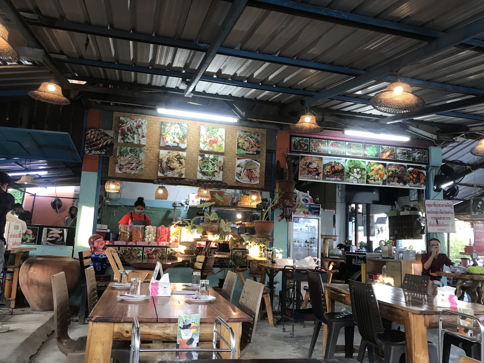 Previously, I had told my friend that I wanted to eat Isaan food. After paying homage to the Buddha my friend brought me to a Thai Isan style restaurant. The restaurant, named Tam Nua Krua Pa, located along the road, has about 15 tables. It is not recommended to come around noon because there are many customers, so you may have to wait a long time. We came around 5 o'clock. By the time we arrived there were about 3-4 other tables already full. After we finished eating, about an hour, all the tables were already full.