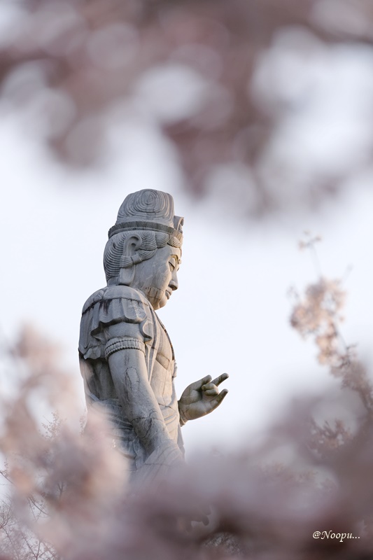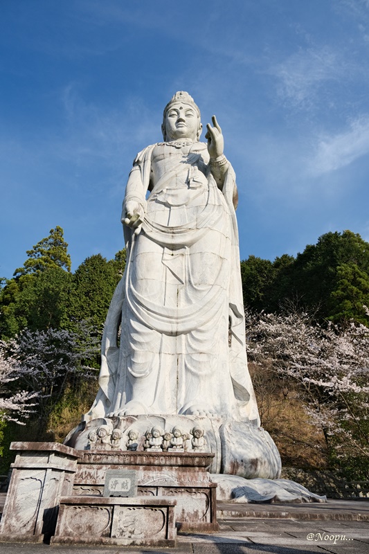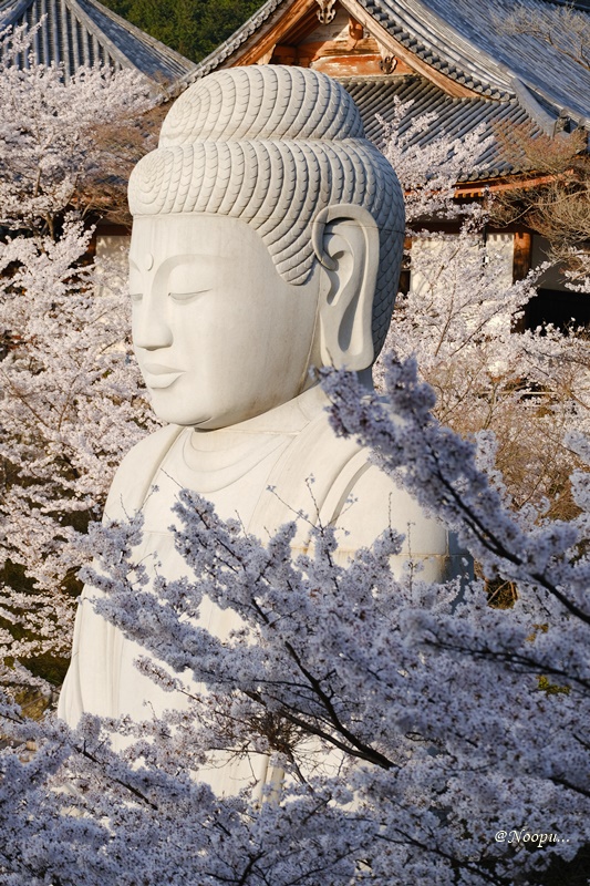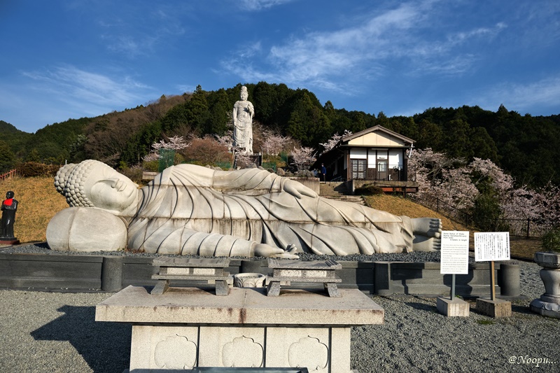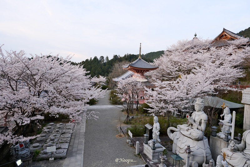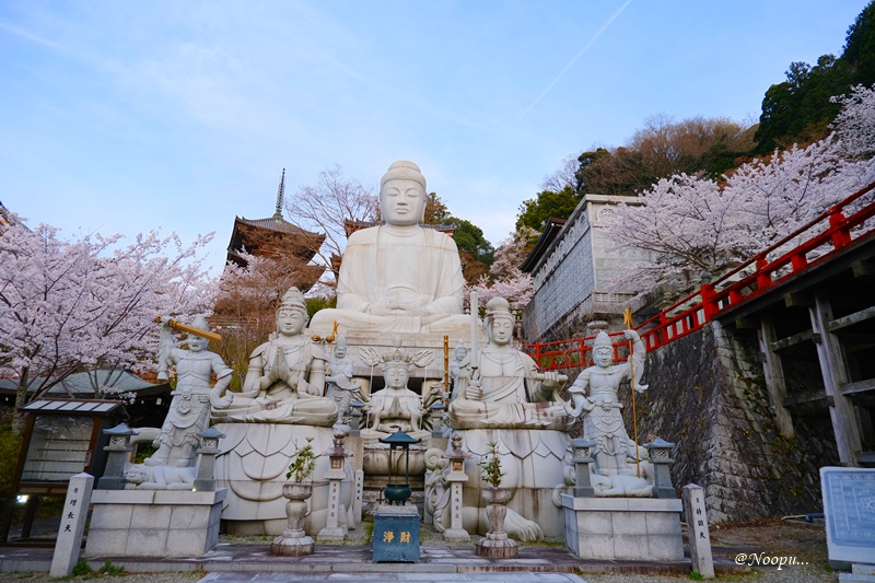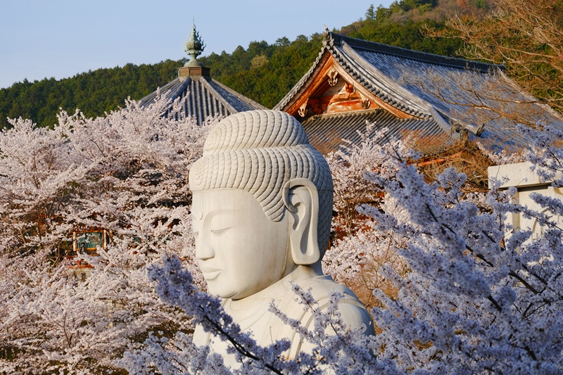 Tsubosaka-dera Temple is located on a mountain overlooking a scenic view of cherry blossoms in spring. There are three big statues - sitting, sleeping, and standing - in the temple area. One of the three statues is a landmark of the temple because it is surrounded by cherry blossom trees.
