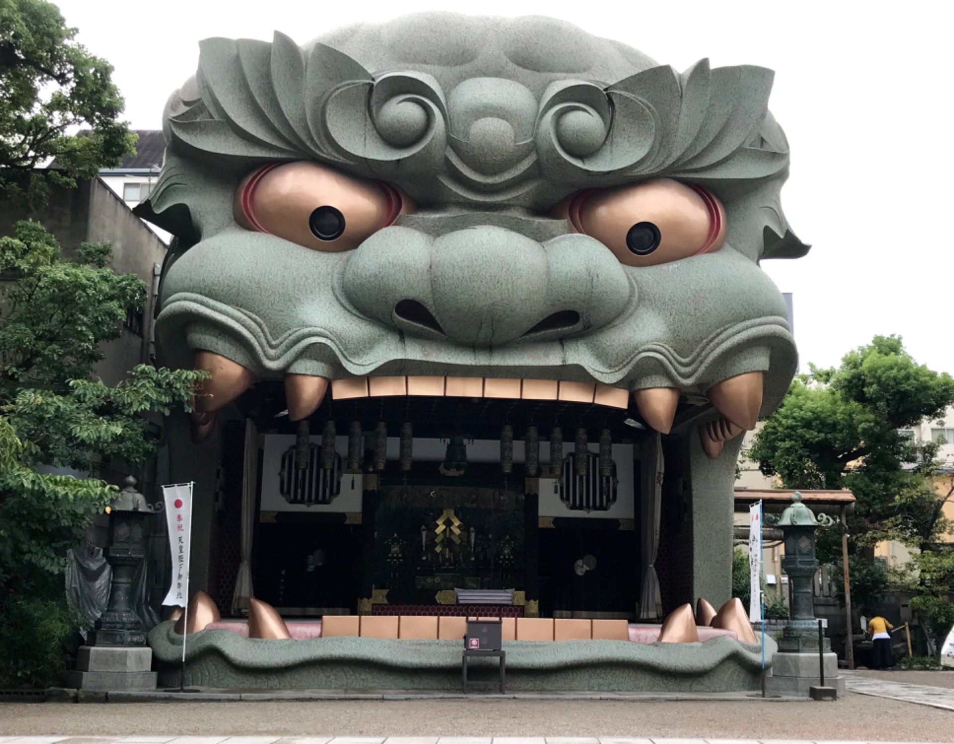Namba Yasaka Shrine is located about 5 minutes by foot from Namba Station. This shrine has a famous, enormous lion head shaped stage and it was built in 1975. Why did is the stage shaped like a lion's head? Because it is believed that the huge open mouth of the lion will swallow evil spirits and bring good luck for succeeding in business or school.