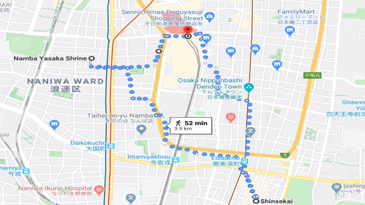My half-day cycling tour itinerary includes Namba Yasaka Shrine, Tsutenkaku in Shinsekai, and Namba-Shinsaibashi shopping street. The total distance is about 4 Kilometers. You can see the route below.