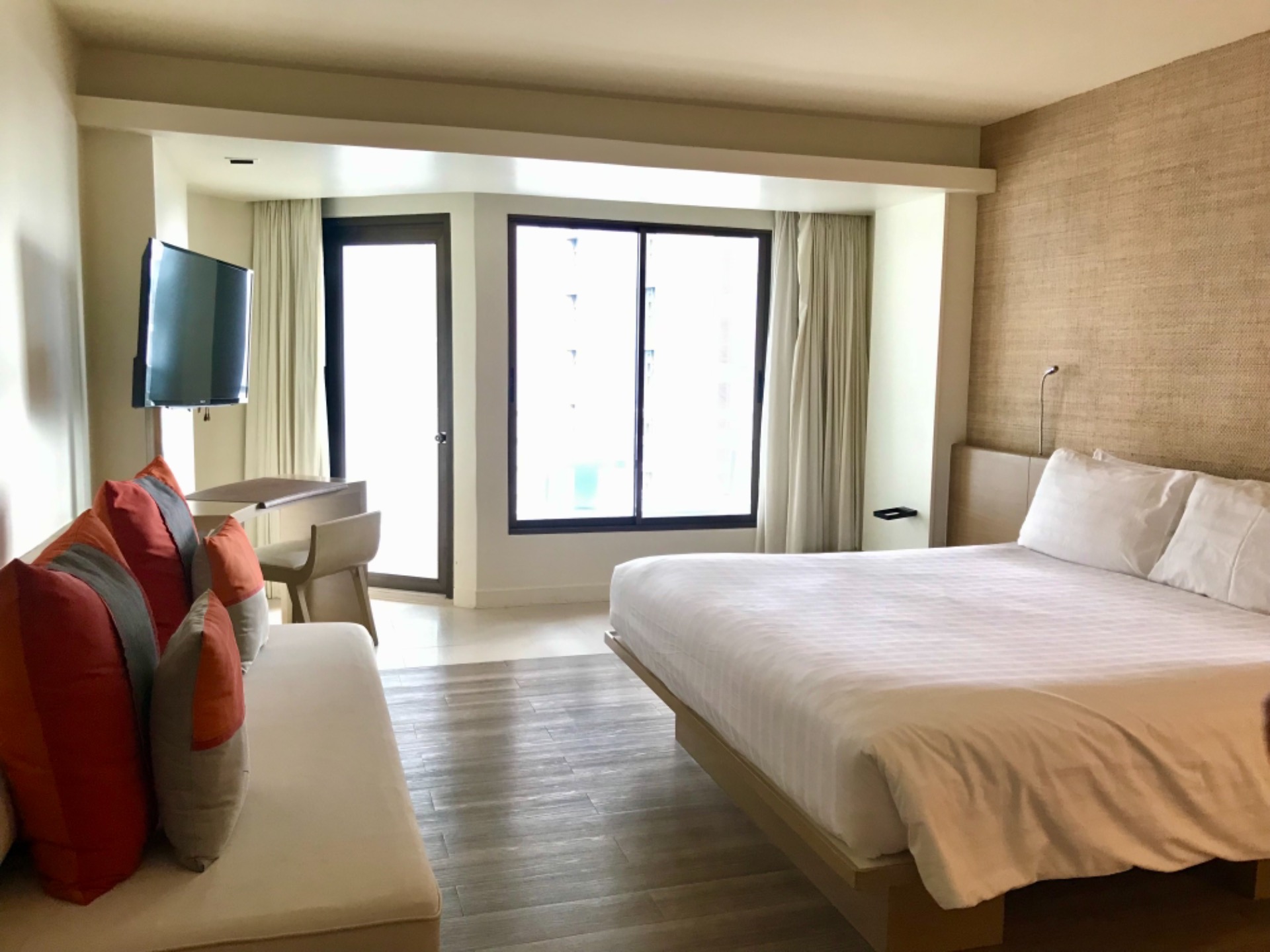 There are various types of rooms in this hotel. They have family rooms, executive club rooms, deluxe rooms, and pool access rooms with full facilities called Lannai. We booked a deluxe room with a king sized bed and a partial sea view.