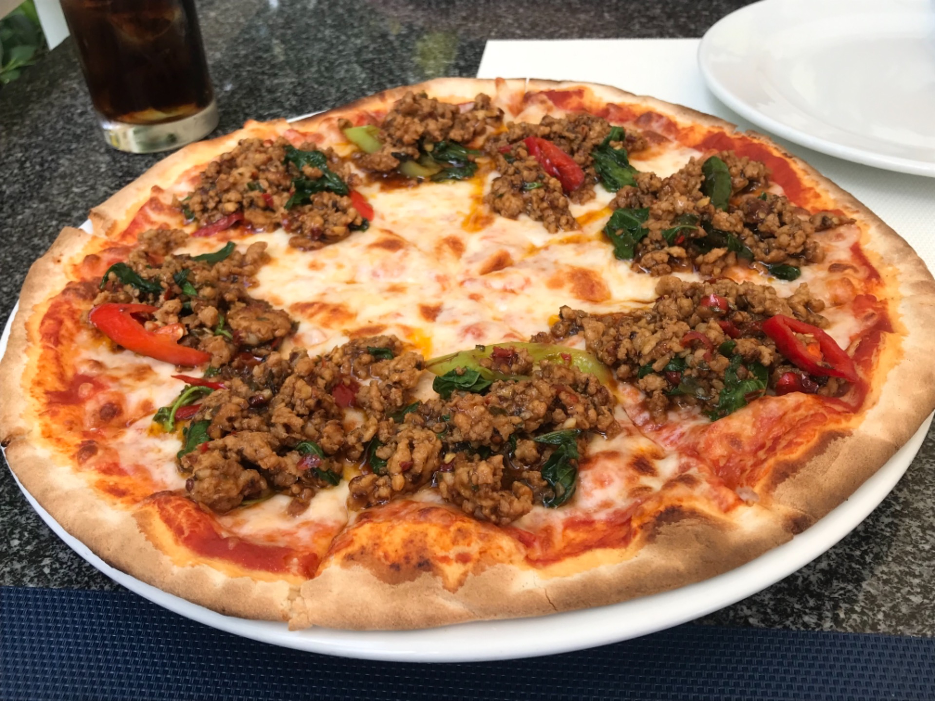 The restaurant serves Thai food, burgers, pizza, and other dishes. We tried the krapao pizza, a kind of Thai / Italian fusion. It was hot, spicy, and yummy. I recommend trying the fresh coconut juice as well, very refreshing.