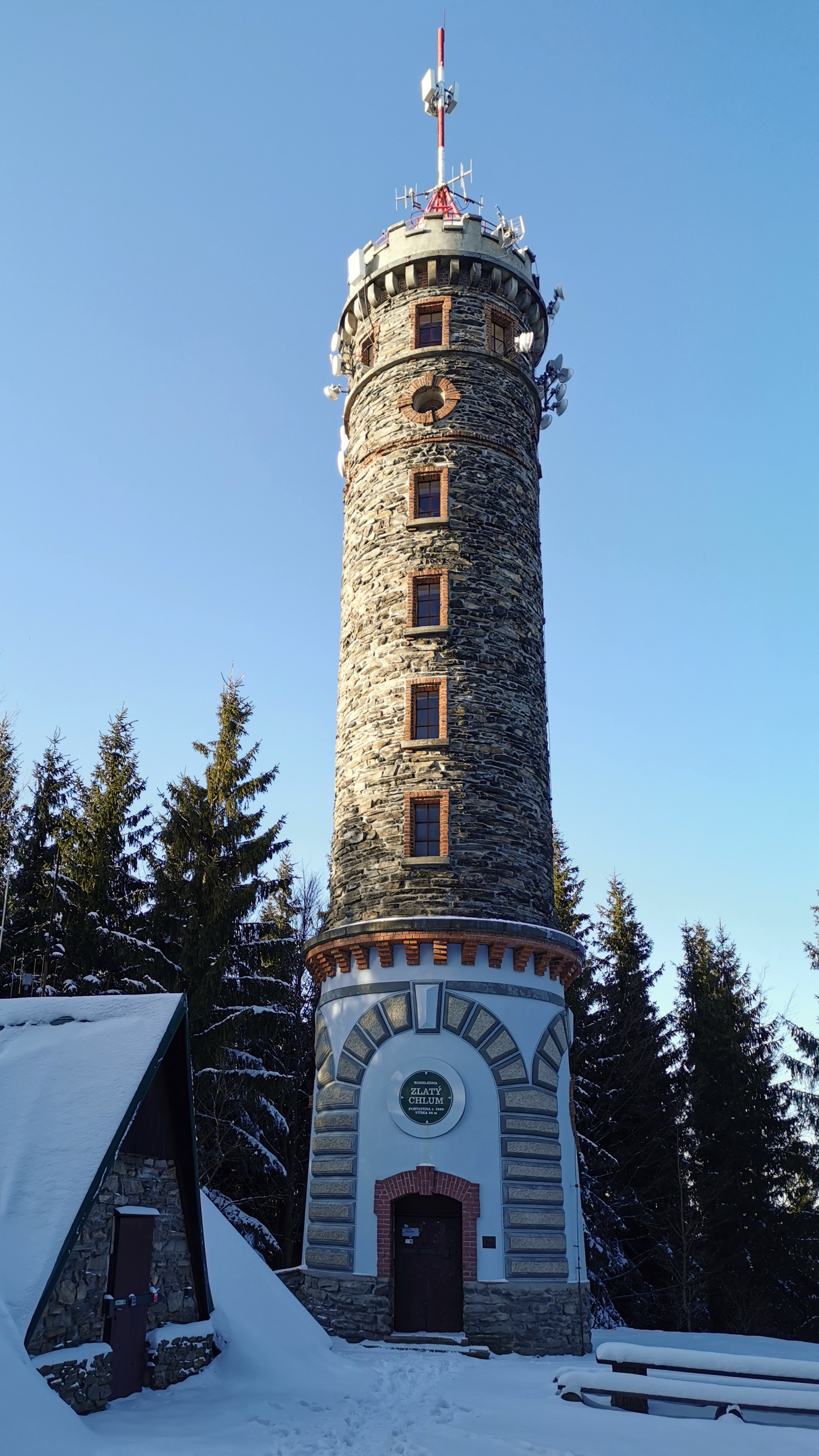 Zlatý Chlum. Finally some look tower :-O A little disappointment: It is winter, therefore, one would expect it to be closed. Yes, that is sad truth. Anyway, it is 26 meter tall gorgeous tower (875m a.s.l). Right next to it, on the left, is kind of cozy hut with some refreshment (though closed too).