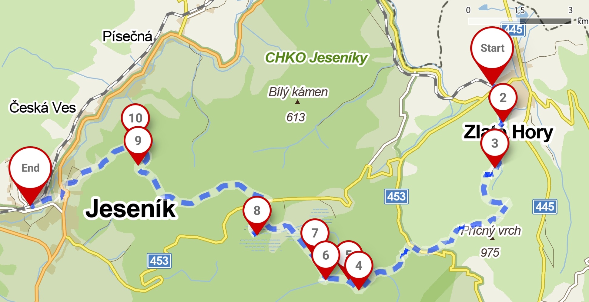 Trek začal ve Zlatých Horách (~400 m.n.m.), skončil v Jeseníku (~450 m.n.m.), vedl přes značené turistické stezky, ale někdy i přes neznačené lesní cesty, které jsou někdy celkem sranda :)