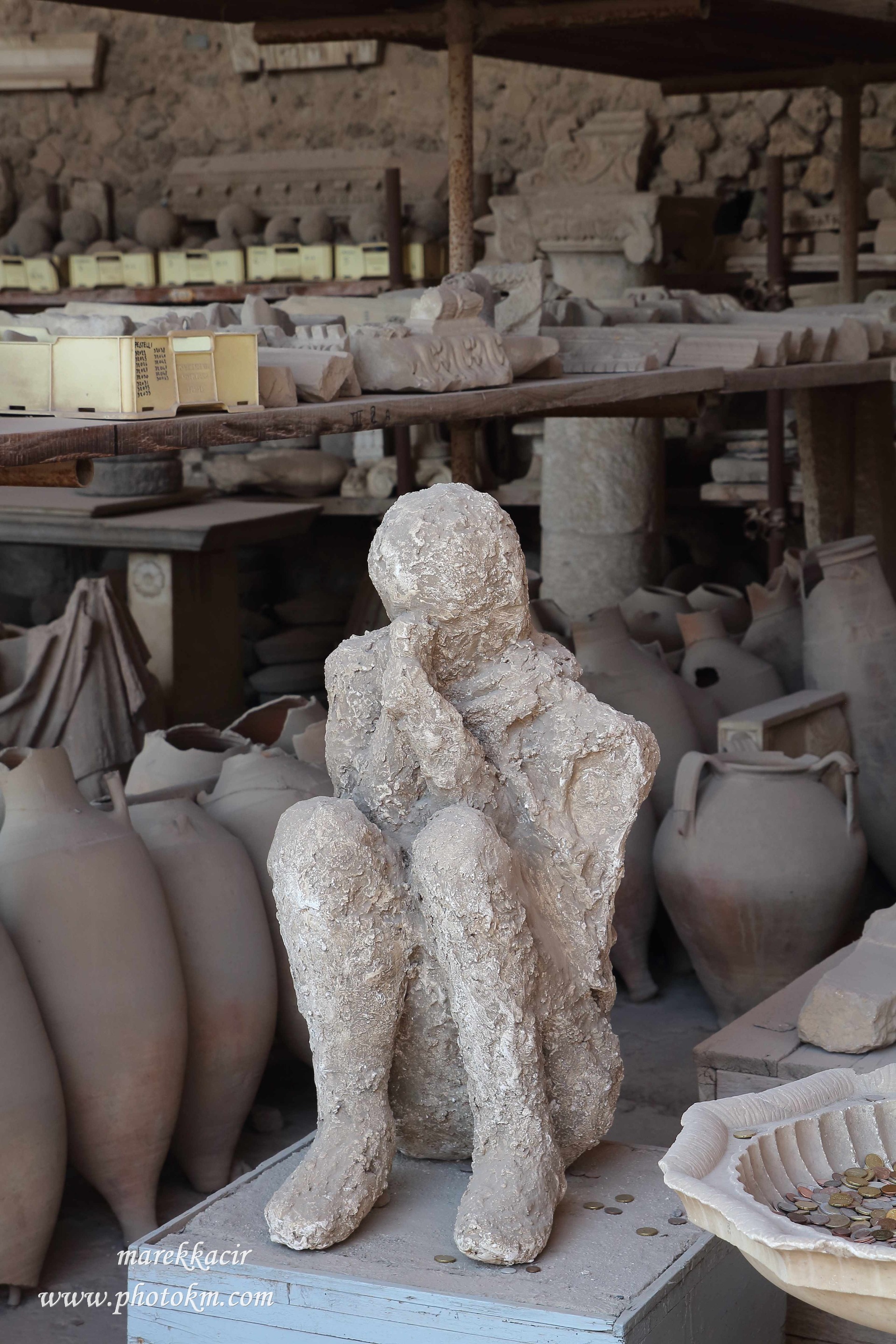 Na záver prehliadky prechádzame okolo nálezov z Pompejí z ktorých mrazí. Vo veľkej miestnosti je zhromaždených niekoľko odliatkov. Tie vznikli tak, že do dutín v zemi archeológovia naliali sadru. Tá stuhla a keď ju vytiahli tak zistili že sa jedná o miesto posledného odpočinku obyvateľov Pompejí a ich polohy, v čase ich smrti. Odliatky nám presne ukazujú v akej polohe zomreli. Pred sebou vidím postavu ktorá sedí a akoby sa modlila a dúfala, že túto katastrofu prežije. Vedľa nej je odliatok psa, ktorý sa obesil na lane pri pokuse ujsť z mesta. Zanechalo to vo mne veľký dojem.