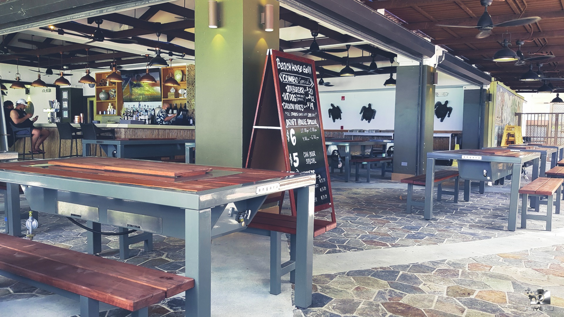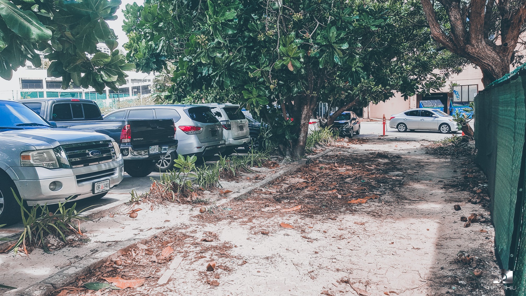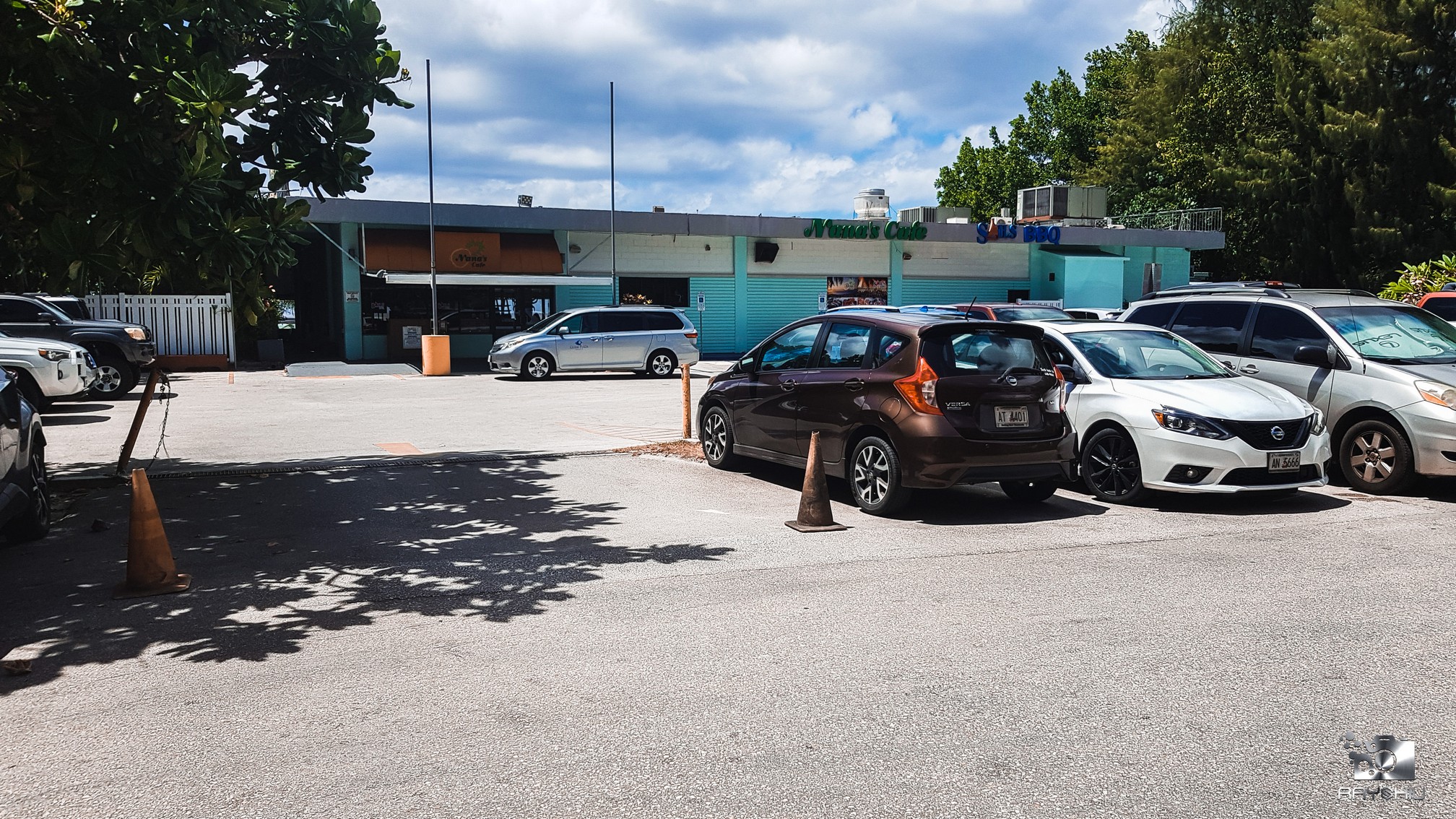 If you're not coming from within the Dusit Beach Resort Hotel, you can access the beach and the Beach House Grill from the main street. You just have to walk a bit (downhill), starting by walking down the side street from DFS Galleria Shopping centre. At the bottom of the hill you'll see the parking lot of Nana's Cafe (picture below). To the left of Nana's (looking at the restaurant from the front), you'll see a path (rather unkept one), that'll lead you to the beach and right to the door step of the Beach House Grill.