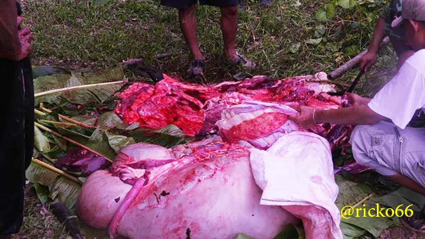 We have been walking for about two hours in a beautiful jungle and mountain landscape, walking in line and really many time I have memories of Vietnam war movies coming to my mind only helicopters missing but I have this feeling of picture already seen. There was one soldier opening the walk followed by the sniper guy than the general, me and the two other foreigners and another four soldiers behind. After entering another jungle part with the opener cutting the branches with his machete to make the way for us, he made the signal with his fist to stop a few times than for a minute or so we were listening at the sound of the jungle and its animals. As we look around I can't see anything that is a potential target but the general put his hand in front of me and I saw the sniper moving forward in front of the opener, he was walking slowly and bend a little than after looking at a distance and moving another meter or so he point his rifle, I was looking in the same direction than the rifle but still can't see anything and after he adjust his rifle he took the shot and just after the opener and the general say something and look kind of happy, so I knew that he got it, but what it was? Sniper and opener were both kind of running and jumping to get close to their target and we all followed behind. Than after walking two minutes or so we arrive next to the body of a kind of strange cow that I never see before, after asking the general about it he told me that it was a Banteng (a wild jungle cow) from what I was seeing it was shot dead as a big chunk of its neck was missing from the bullet impact. Very quickly all the soldier were around it and start to put some rope around the body but the general told me that it wasn't the solution to carry it back to the camp even in smaller pieces but instead a soldier took his walkie-talkie and ask the camp to come with one elephant to carry the body back at the camp. We all pull the rope until we arrive at the walkway that is along the forest. We let the body there with two soldier and walk back to the camp. We arrive at the camp around noon and have a meal at the mass, than after that it was time for a little sleep as the day was hot but without sun but mist and very high humidity. Later that day I was walking in the camp to take a few pictures when I arrived were a few soldier were about to cut some meat around the body of the banteng, it was already impossible to say that it was a banteng as it has been cut already and pieces were missing.