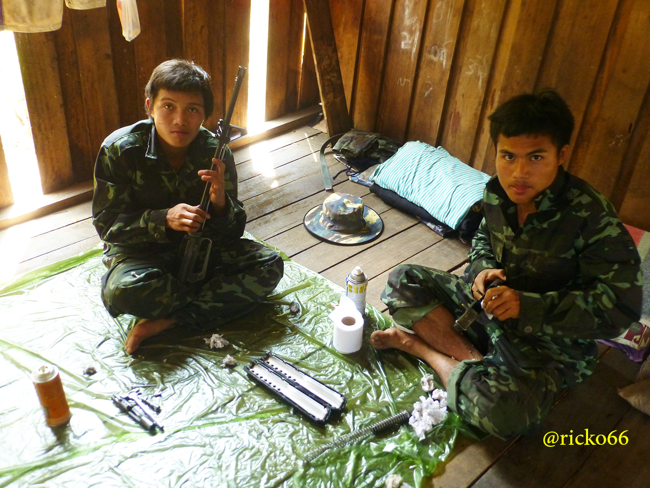 Next day morning, same as the day prior wake up with captain good mood handling us a coffee and told us that we have to go next to officers'mass and get ready for hunting. The general arrived with a gun in each hand and put it on the table. Both of these gun has a little tripod under and at first look it seems to be guns for snipers or something like that. After having open both tripod the general told us that these two gun will be used for the hunt and add that the guy next to me (a soldier) will take one of the gun as he is a famous sniper with three Burmese officers taken down on his causality board. Officers are the most difficult target as they always in the back and never on the front line. This guy can stay 3 days in the same position in the hiding until he can get the shot at his target. I am not into guns but I can say that one of the guns is a kind of rifle but from its external aspect it look like a sniper gun maybe because both gun have a little tripod under and a a viewfinder on the top, the other gun is a kind of machine gun that reminds me the M16 in the shape but more modern. The general told us to keep camera and other non waterproof device and papers at the camp because the weather wasn't looking good and we will possibly face some rain and in the jungle after 15 min of rain it is not surprising to get stuck in the mud at knee level making the walk a nightmare. The general grab the other gun and we are on our way walking along two mountains. These two gun are high velocity weapon and are use to get targets from far but it is not like other guns it not leave a hole but instead can easily cut a person in two pieces, especially with the kind of bullet they use in these gun. He told me that him or his soldiers will better get the head of the animal than the body as it is very damaging for the meat.
