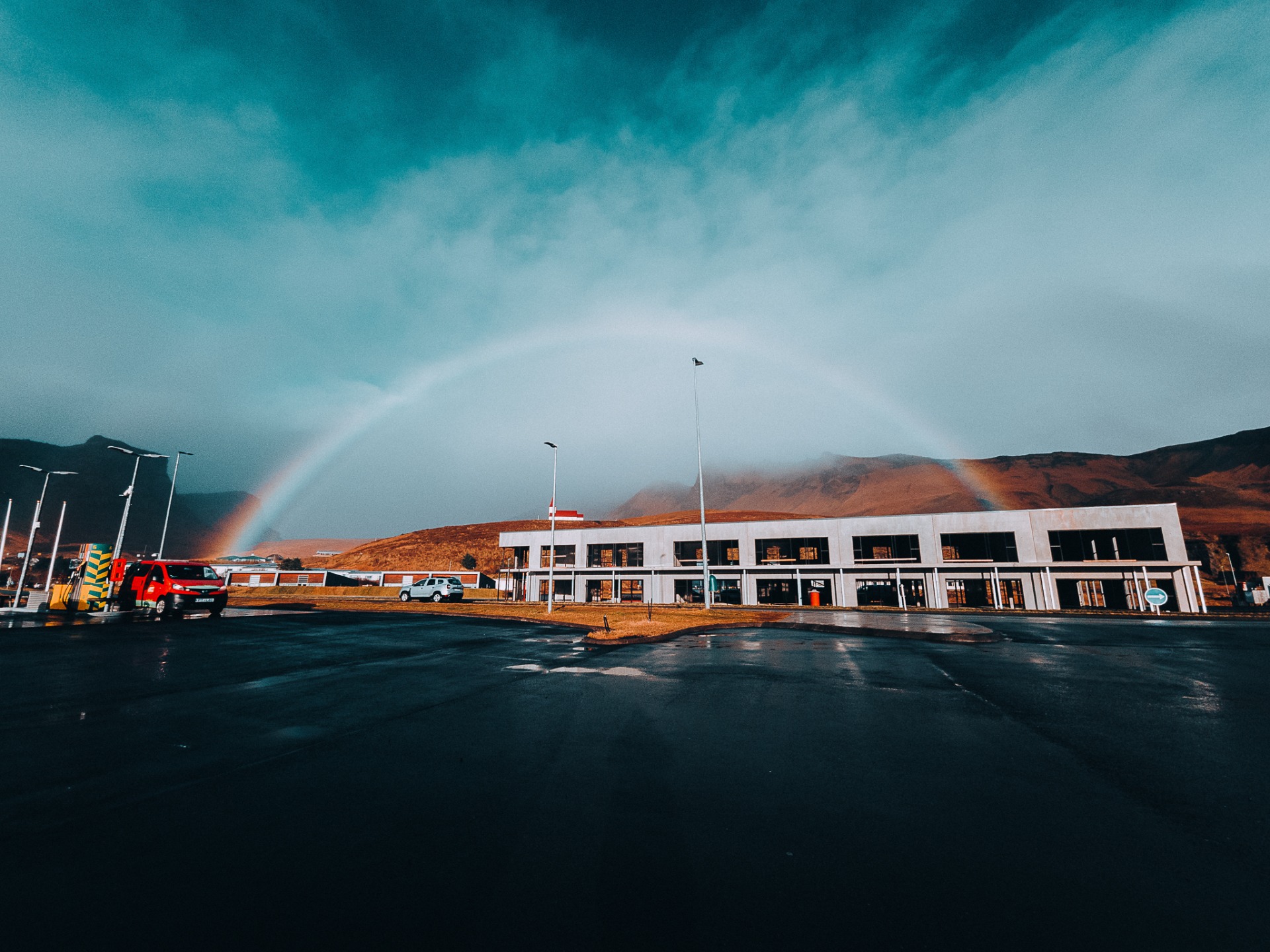 After a bit of driving, the skies opened up a bit and the weather began to change. We were driving through a small town and then we noticed a FULL huge rainbow and had to pull over to check it out!