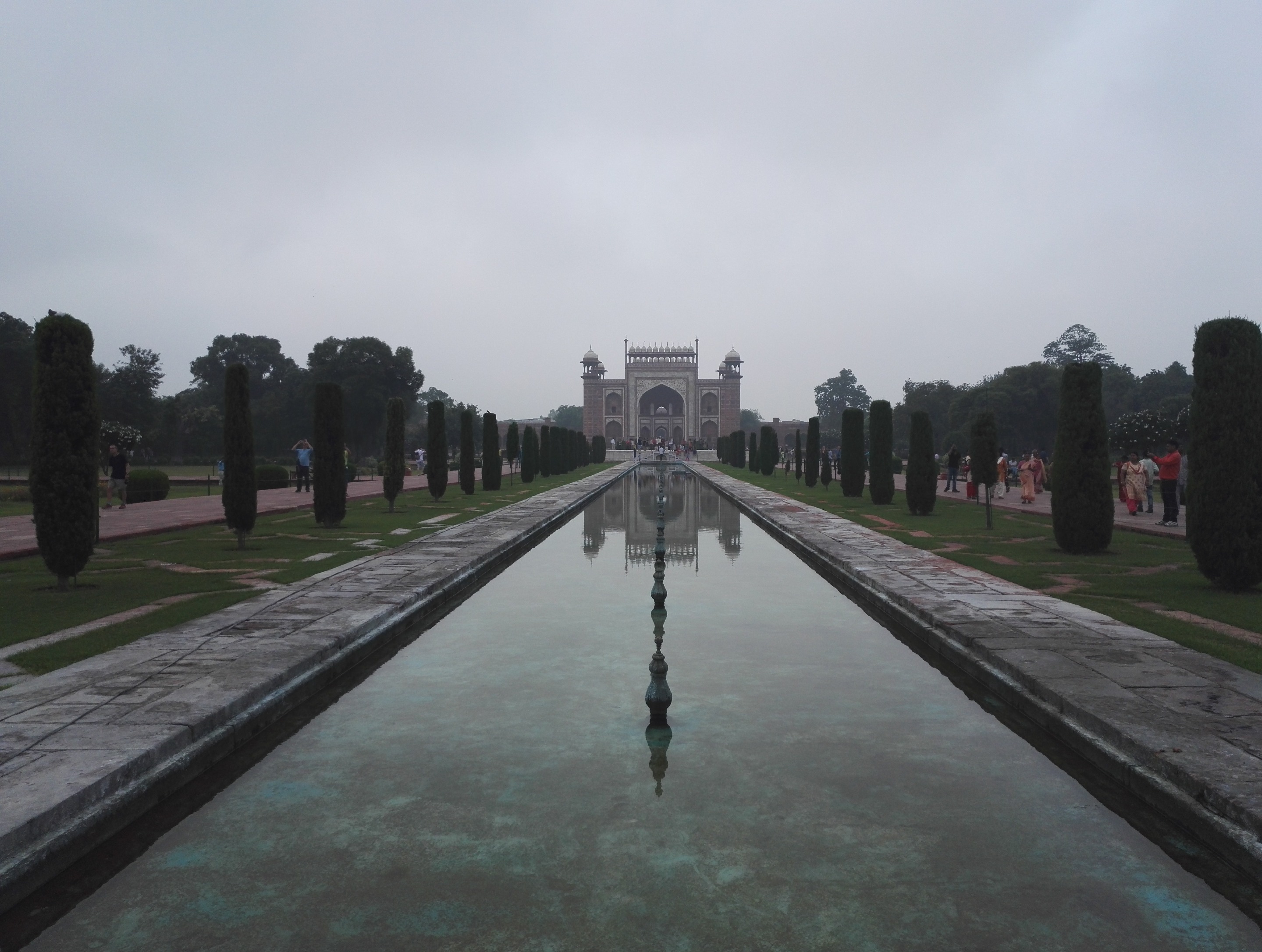 this picture was taken right from the front of Taj mahal and it is very awesome view , From How long you look to Taj mahal it will look the same size if you Go far away the Way of the design they have constructed it look very perfect and well designed.