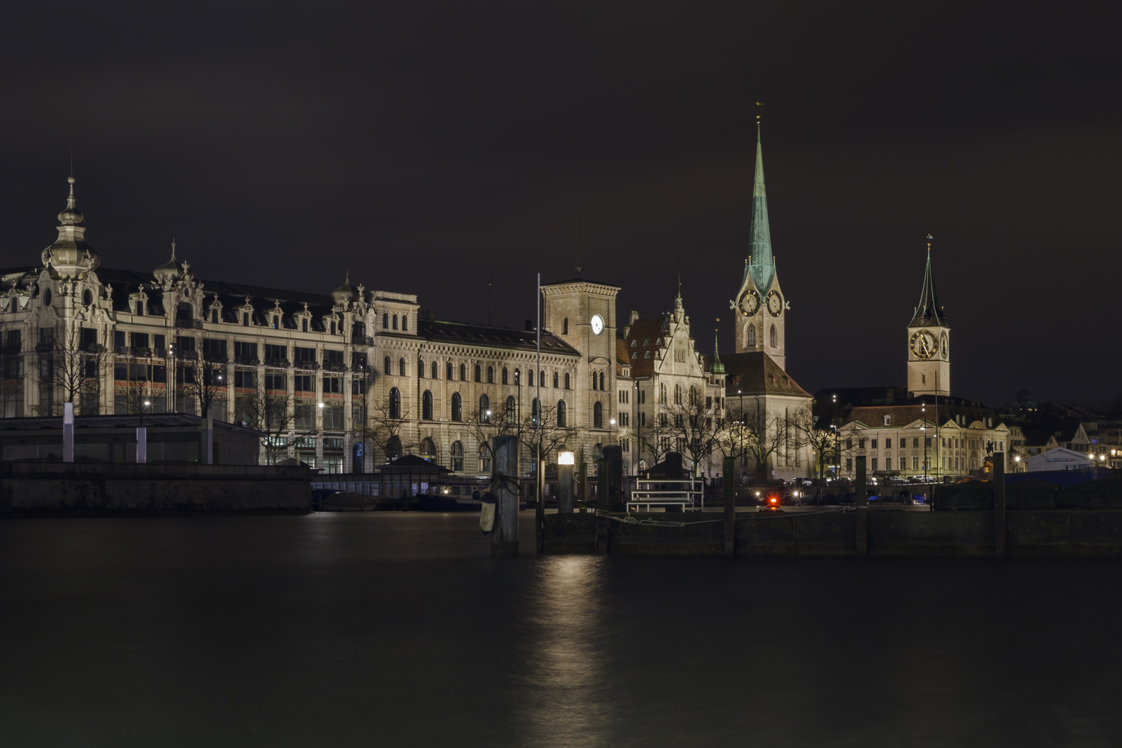 The first thing we wanted to see was the lake, so we went to it. We walked along Bahnfhofstrasse which was about 1km. When we reached the lake it was terribly dark, and in addition, the lake was foggy. So the plan didn't work out well. That is why we headed back towards the station, this time along the right bank of the Limmat River, where several historic buildings are located. It was after ten o'clock in the evening and the streets were quite empty. Since we had enough time, we looked at shop windows and found interesting stores. Such as store design lamps.
