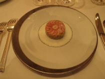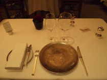 Table setting. The dishes are very luxurious. I didn't take a picture, but the little note on the top right of the table is a vintage wine chart. This chart displays wine grades by year in each region, such as Bordeaux, Burgundy, and Ron, which helps a lot when selecting wine. There is also a wine shop run by Le Taillevent Cave, which seems to be a restaurant that cares a lot about wine.