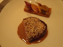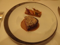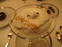 Now for dessert , go beyond , first came dish is pineapple cream under dice a pineapple was laid . At first came amuse bouche with such a texture , but cream , taste is 100% pineapple flavor . Meals start and finish of texture to express gave a sense was a stand out .
