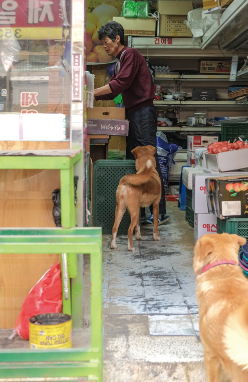 Thanks to the people, I've been confused for a while. When I arrive in an unfamiliar city, I think my situation is similar to the dogs in the neighborhood. You have to look around and meet kind people. There is always a need for delicious food and a safe place to sleep. I see dogs surprised by my small movements, and I feel that I must be nervous. Thanks to the two dogs I met at the market, my friend and I could walk farther and farther away.