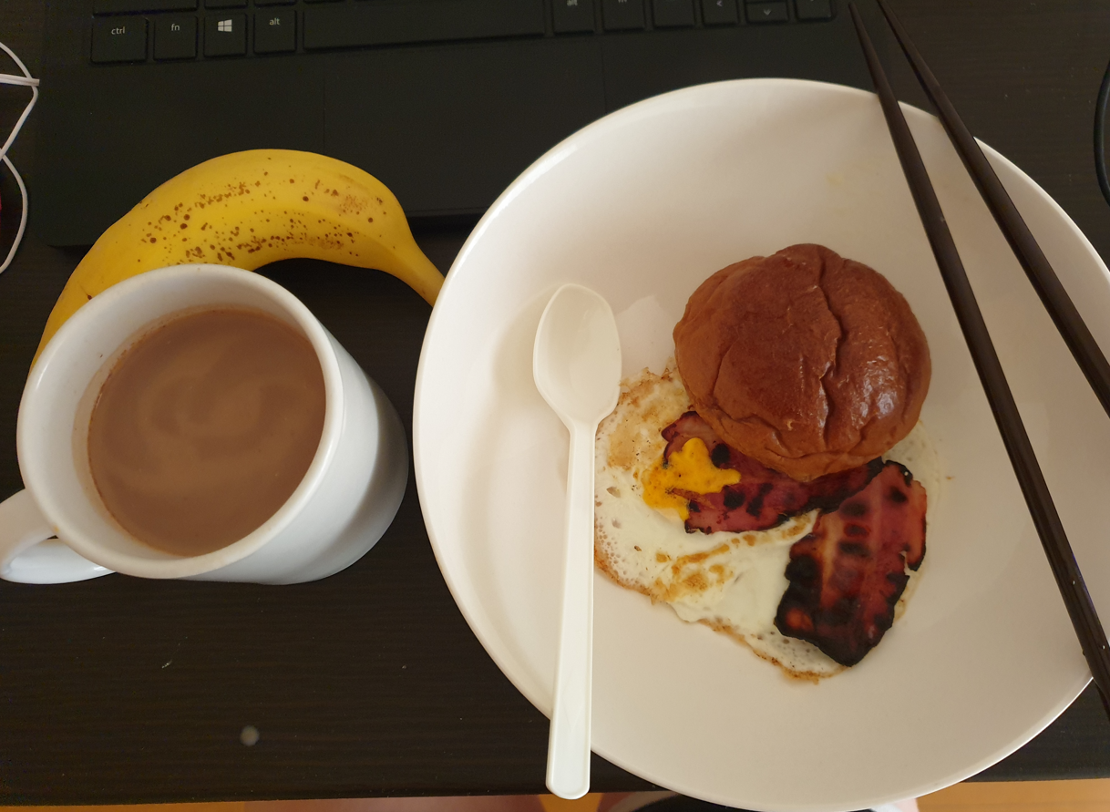 So during the day I would be at home making myself a nice breakfast and/or lunch, do some work and art while waiting for Sean to get back so we could have dinner together. This was my standard breakfast - my favourite black sugar butter roll, a fried egg, bacon, hot chocolate and a banana.