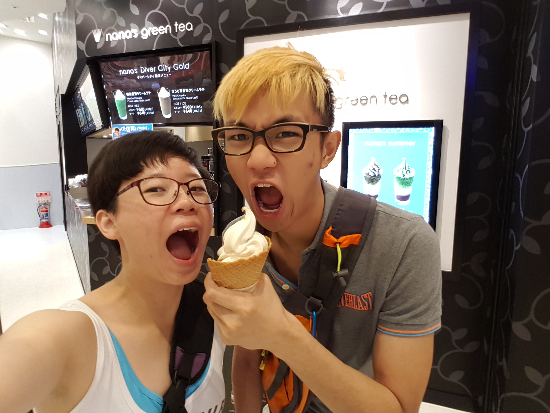 A couple games later, we left the arcade and walked around the mall a bit more. Sean wanted to try this hojicha ice cream, so we got a cone to share.
