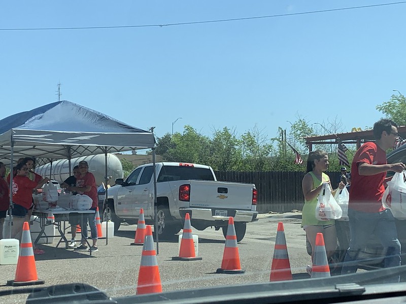 The effort included volunteers from the HEB grocery chain and the local high school to prepare plates and distribute them in a drive-through system. The line gets rather long. Fortunately, they were able to keep it moving at a steady pace.