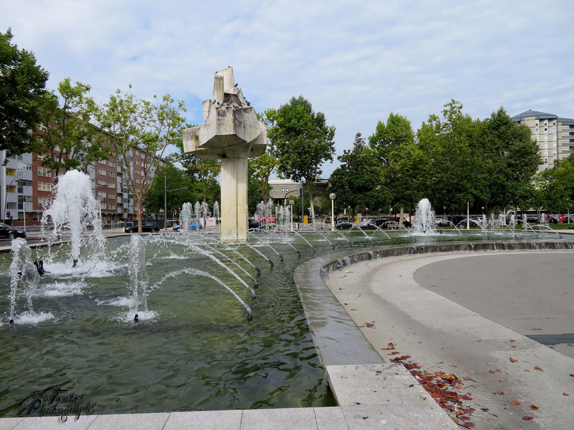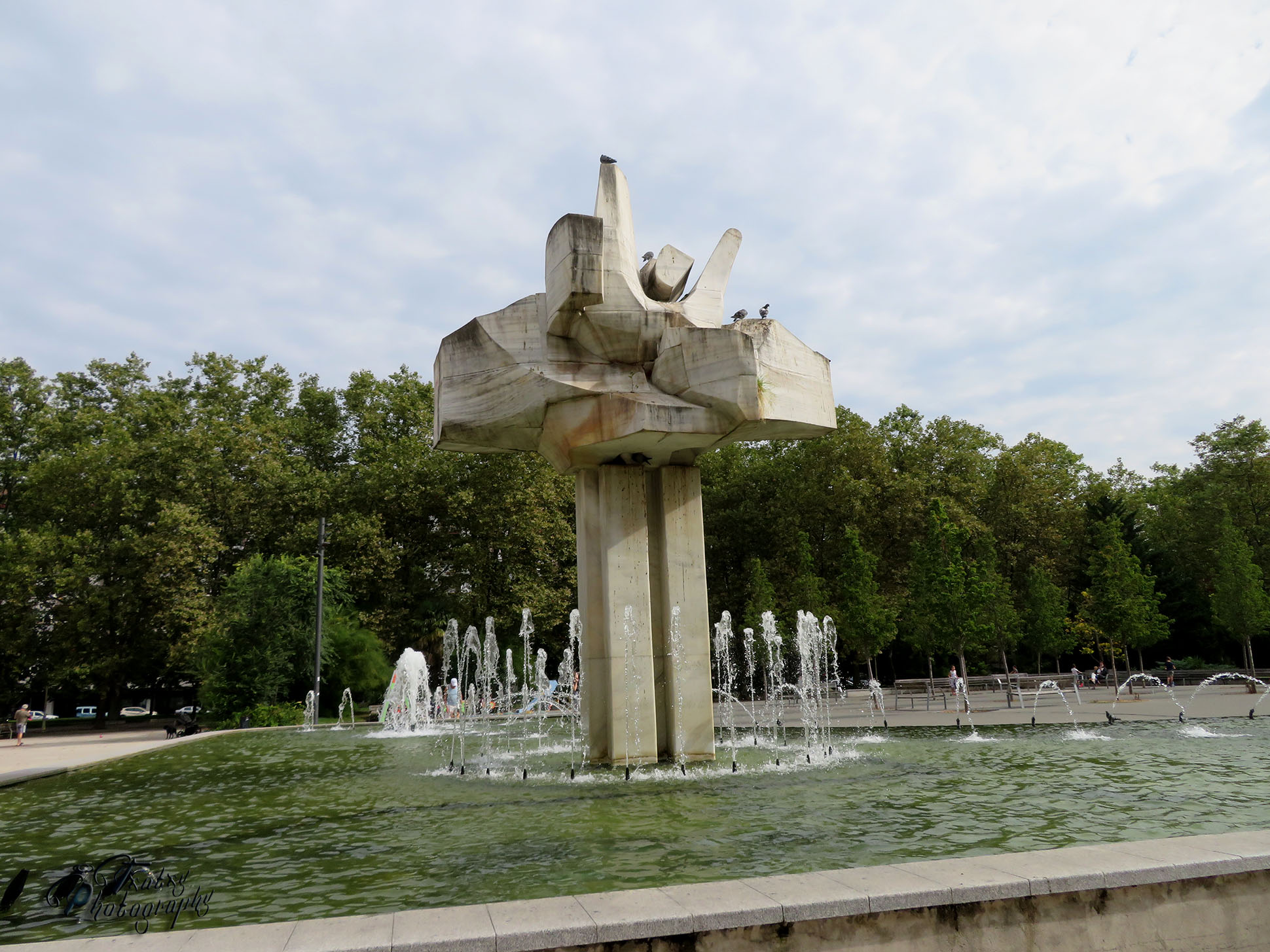We find this great fountain, with its pipes pouring water incessantly