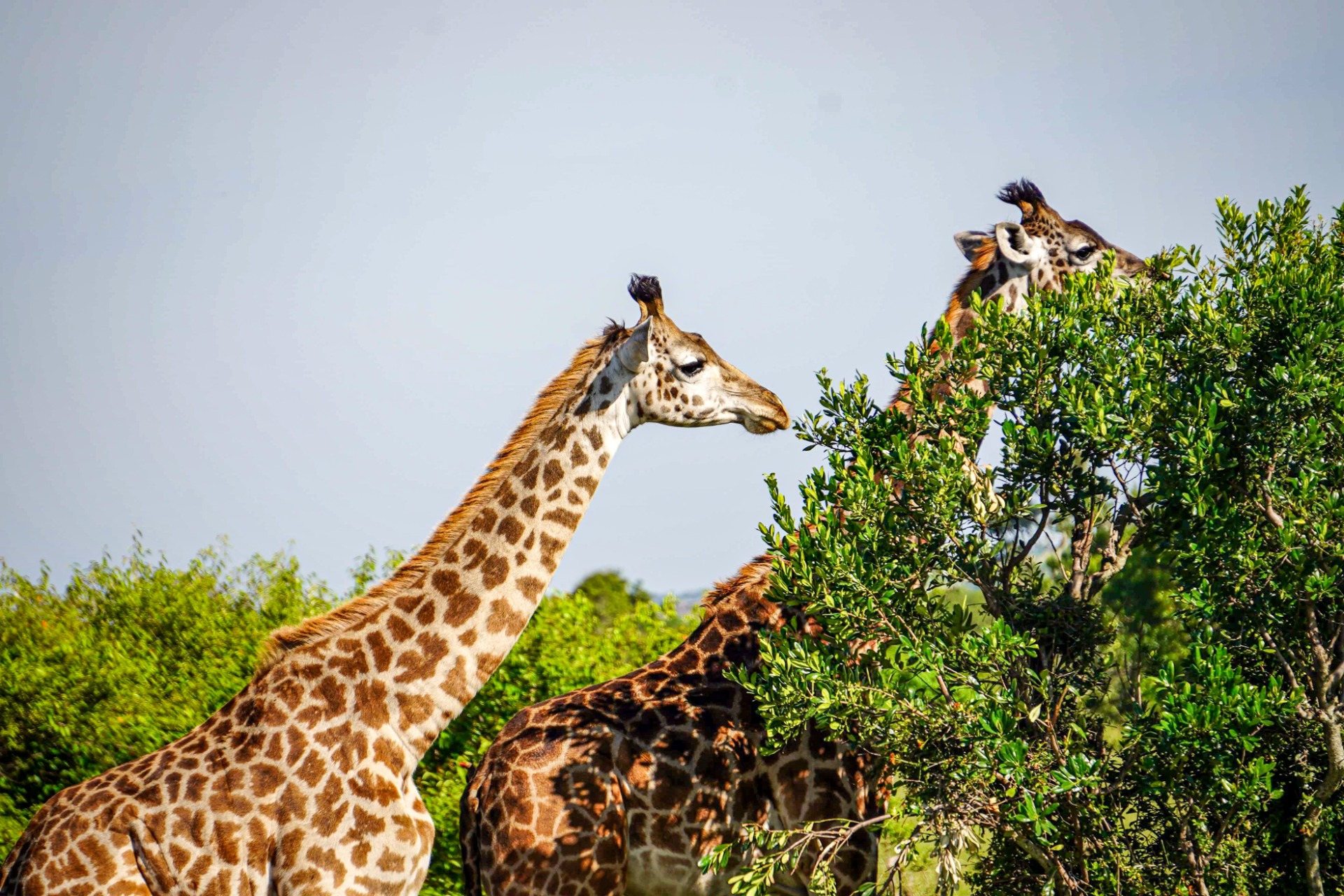 The Masai Mara is full of wildlife in these open plains. Giraffes hanging out nibbling on some acacia trees