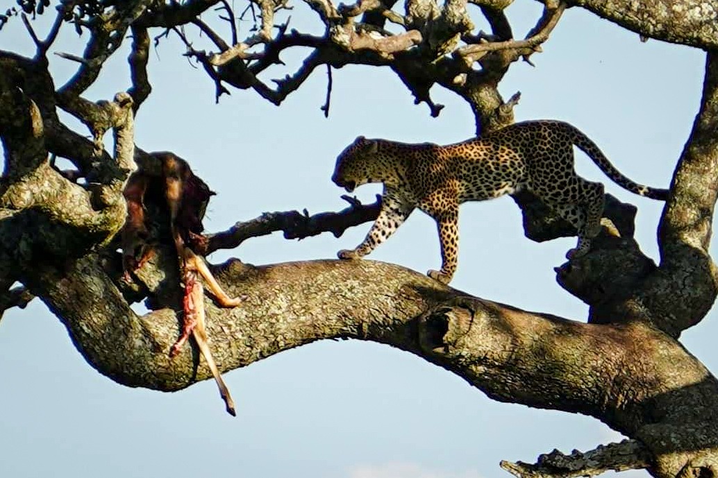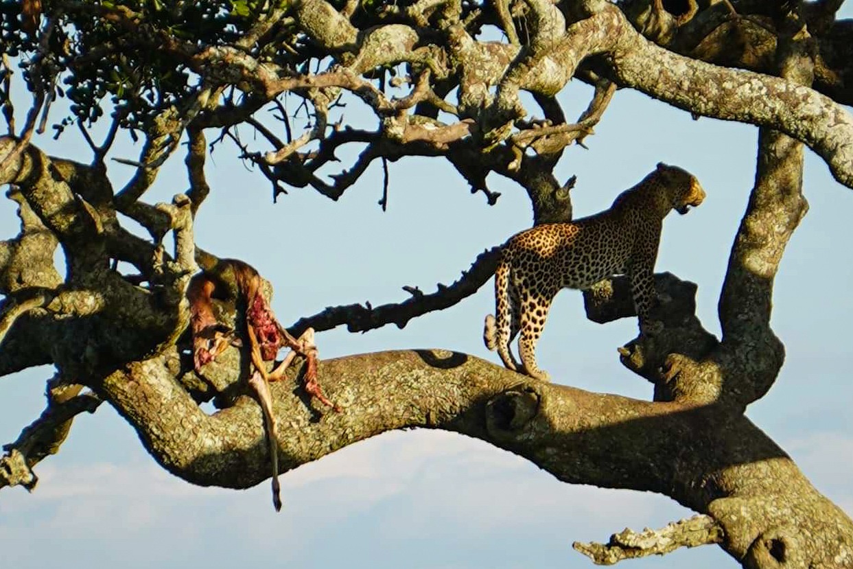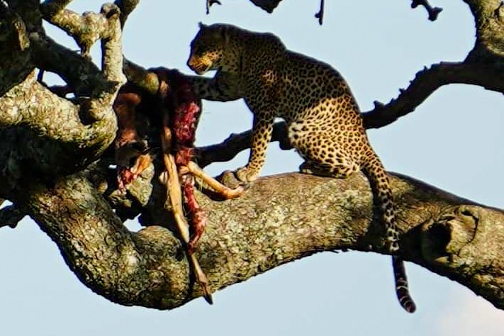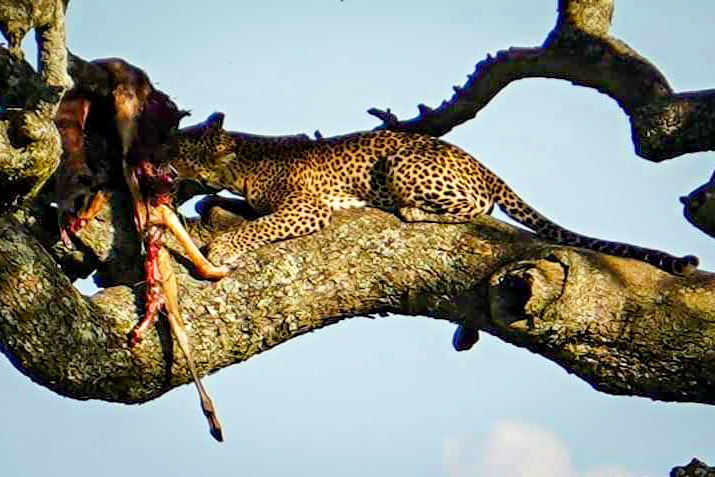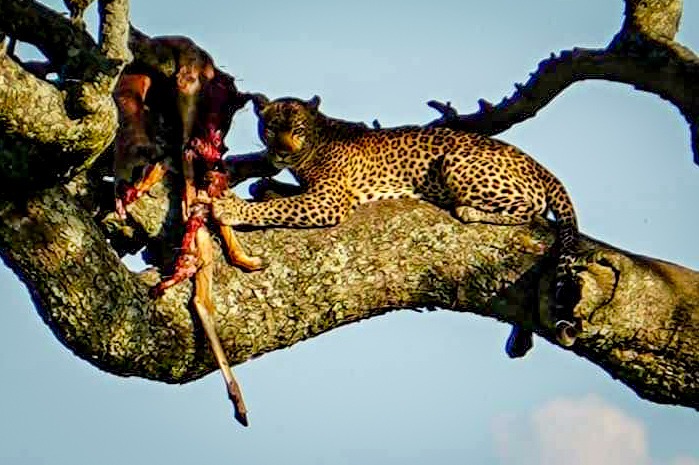 The leopard was the last of the BIG 5 that we had yet to see with our own eyes! As she sat in the tree and feed on her kill.