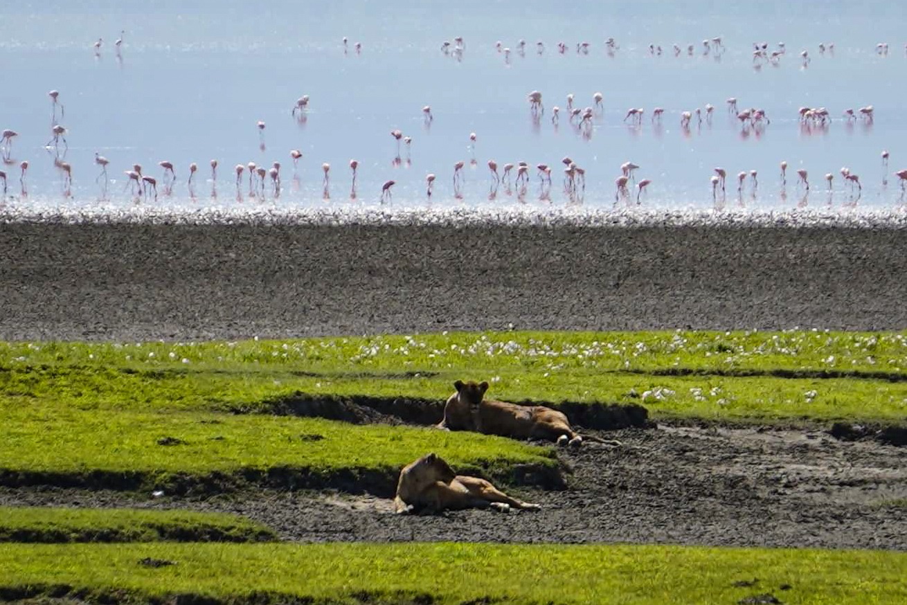 We passed some lioness relaxing near the lake. It was amazing to see so many flamingos in the water!