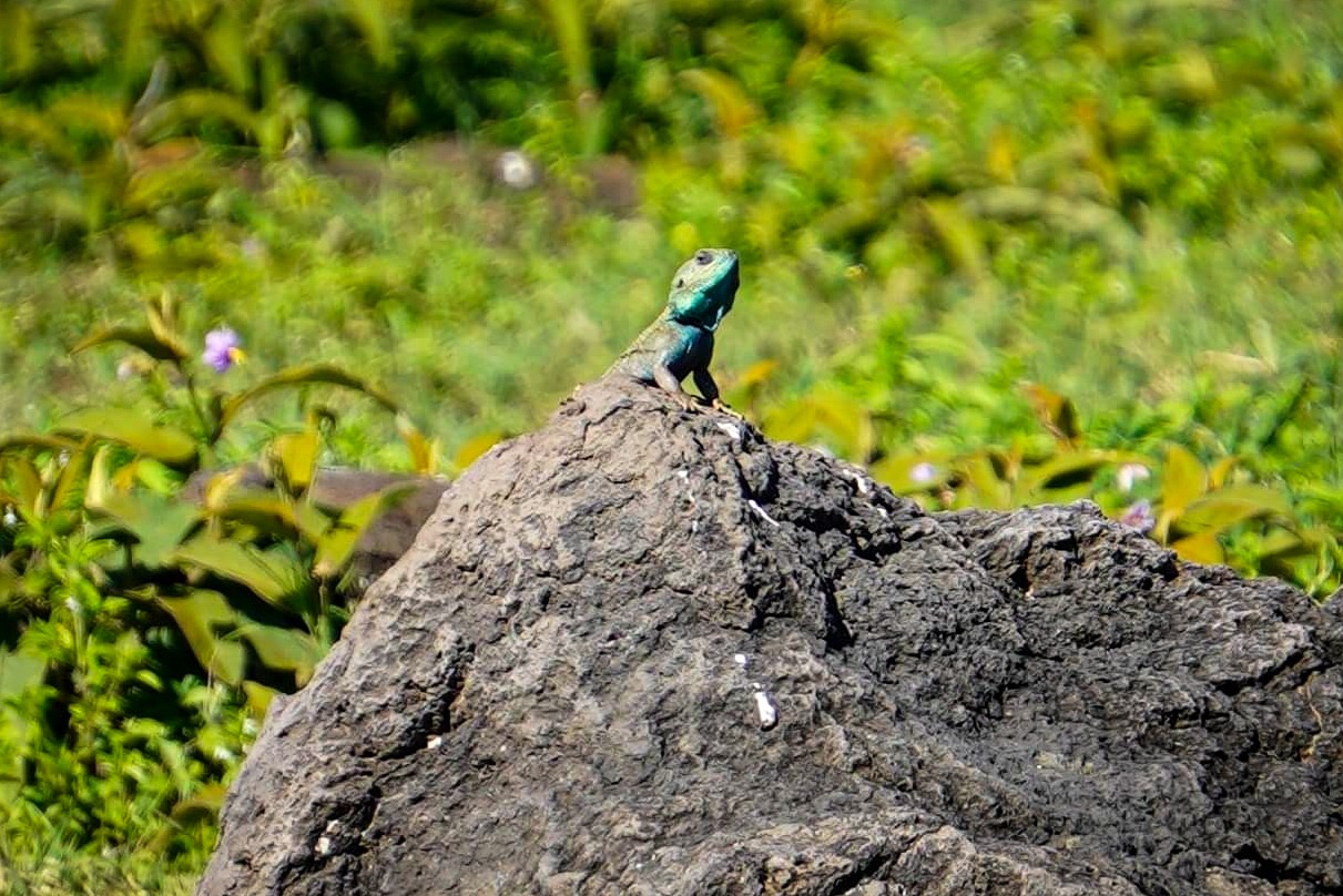 A Green-headed Agama Lizard was sunbaking on a rock.