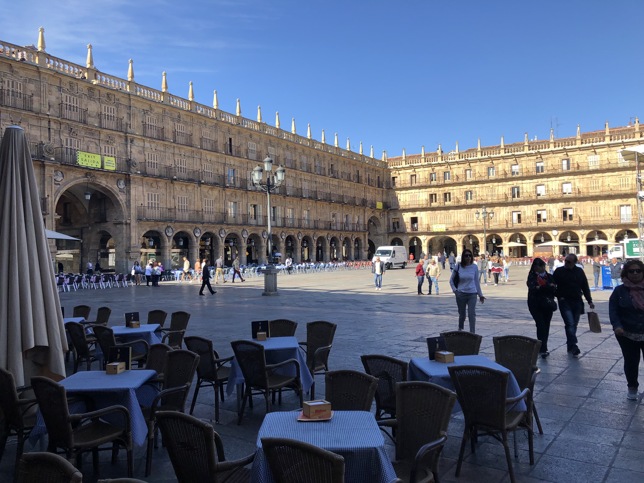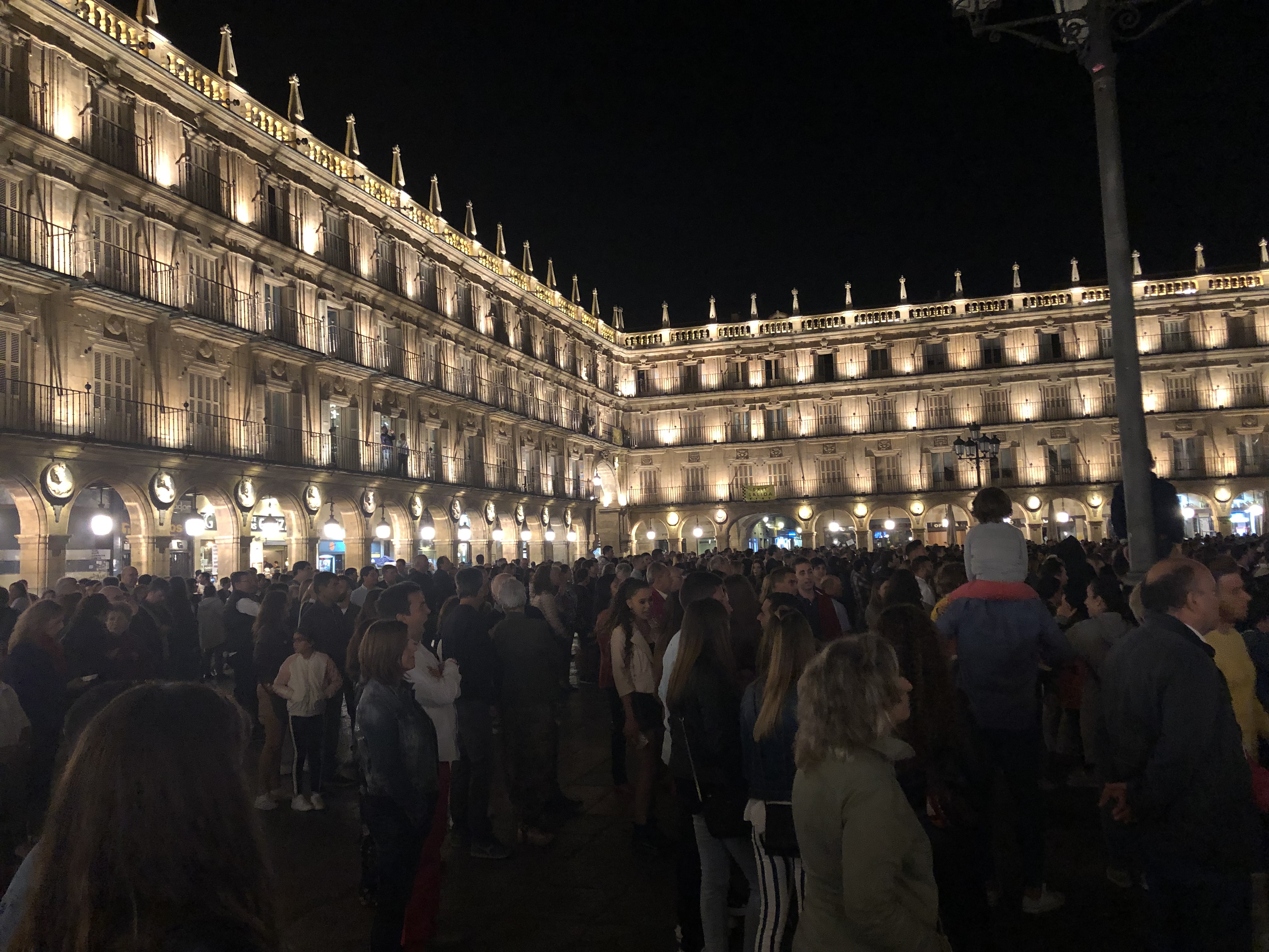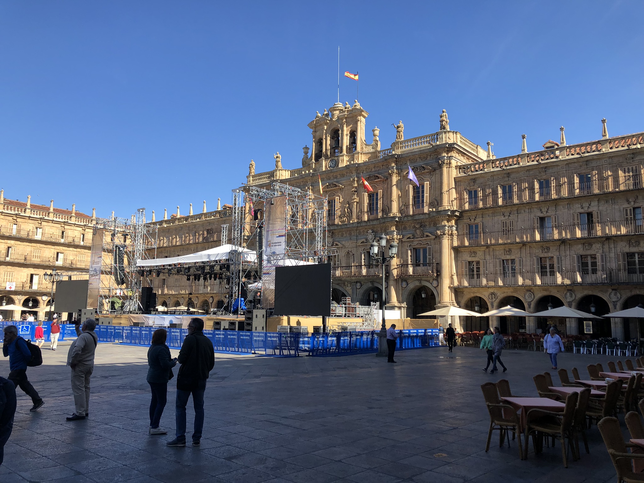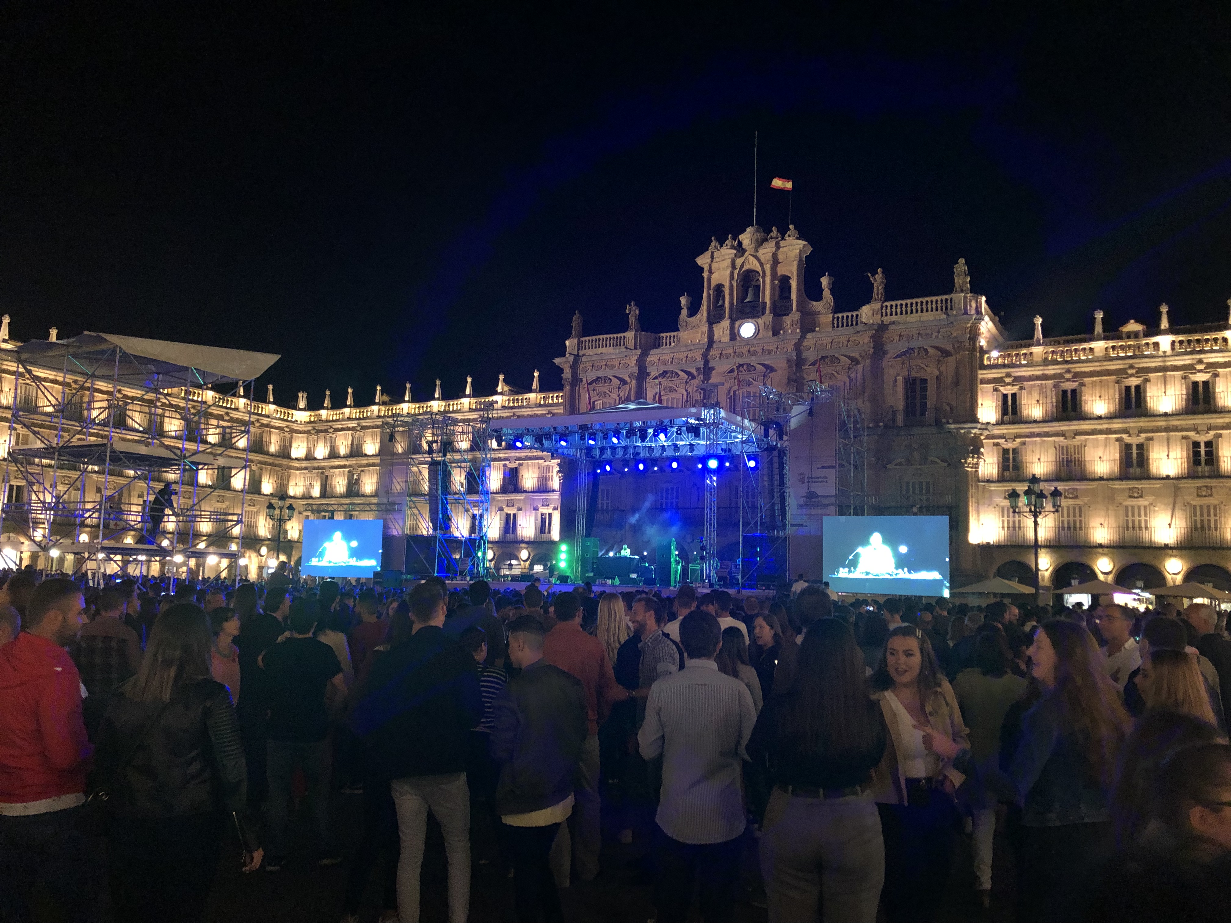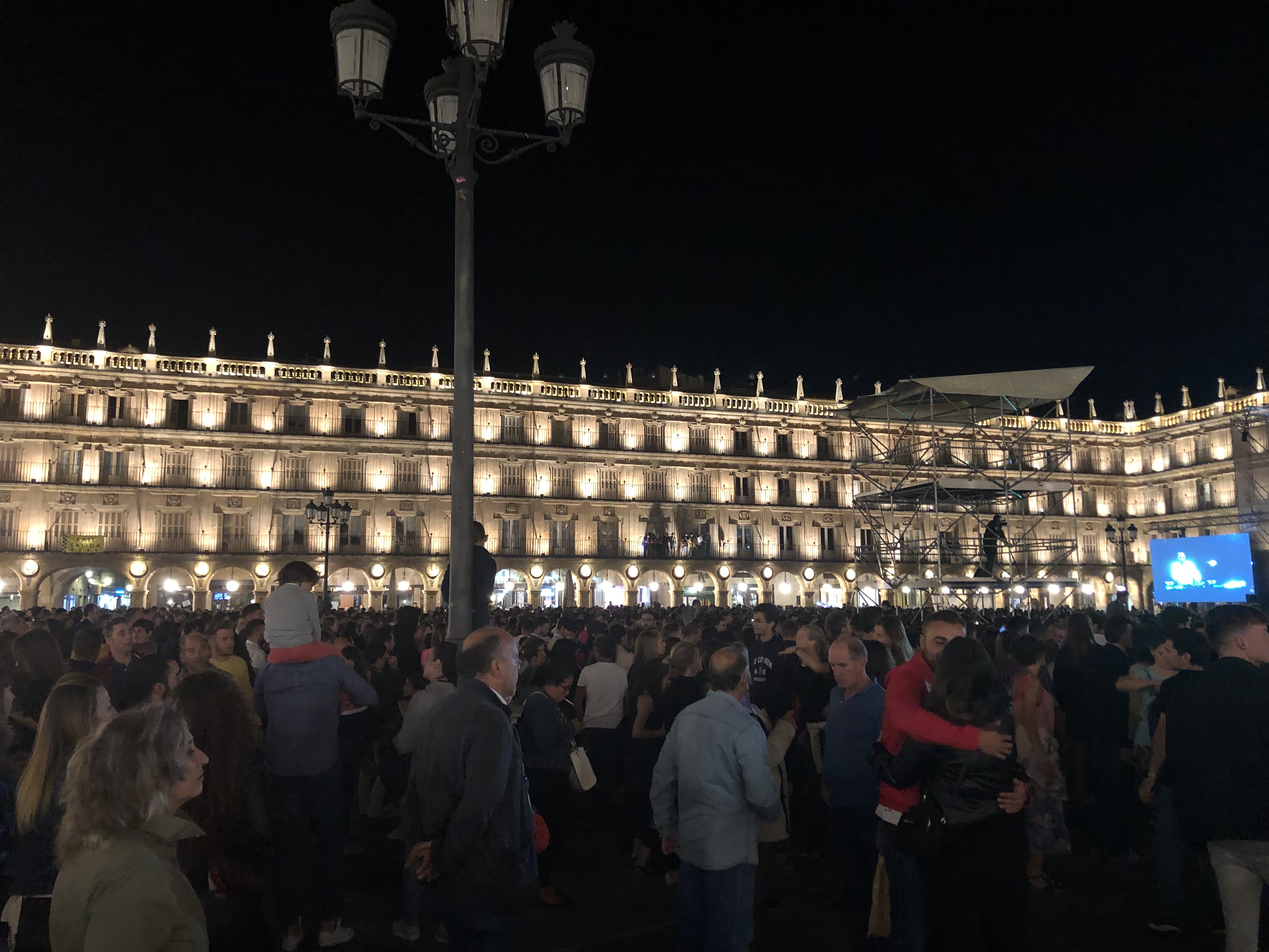 Después de reponer fuerzas con esas tapas seguimos con nuestra visita del primer día, la calle nos llevaba directamente a la Plaza Mayor, también muy cambiada de aspecto con un escenario para las actuaciones diarias de grupos musicales y diversas actividades que componían los festejos, era impresionante la gente que se juntaba y eso que dicha Plaza junto con la de Madrid son gemelas y muy amplias , ya que el arquitecto que las construyó las hizo iguales, la primera fue la de Salamanca.