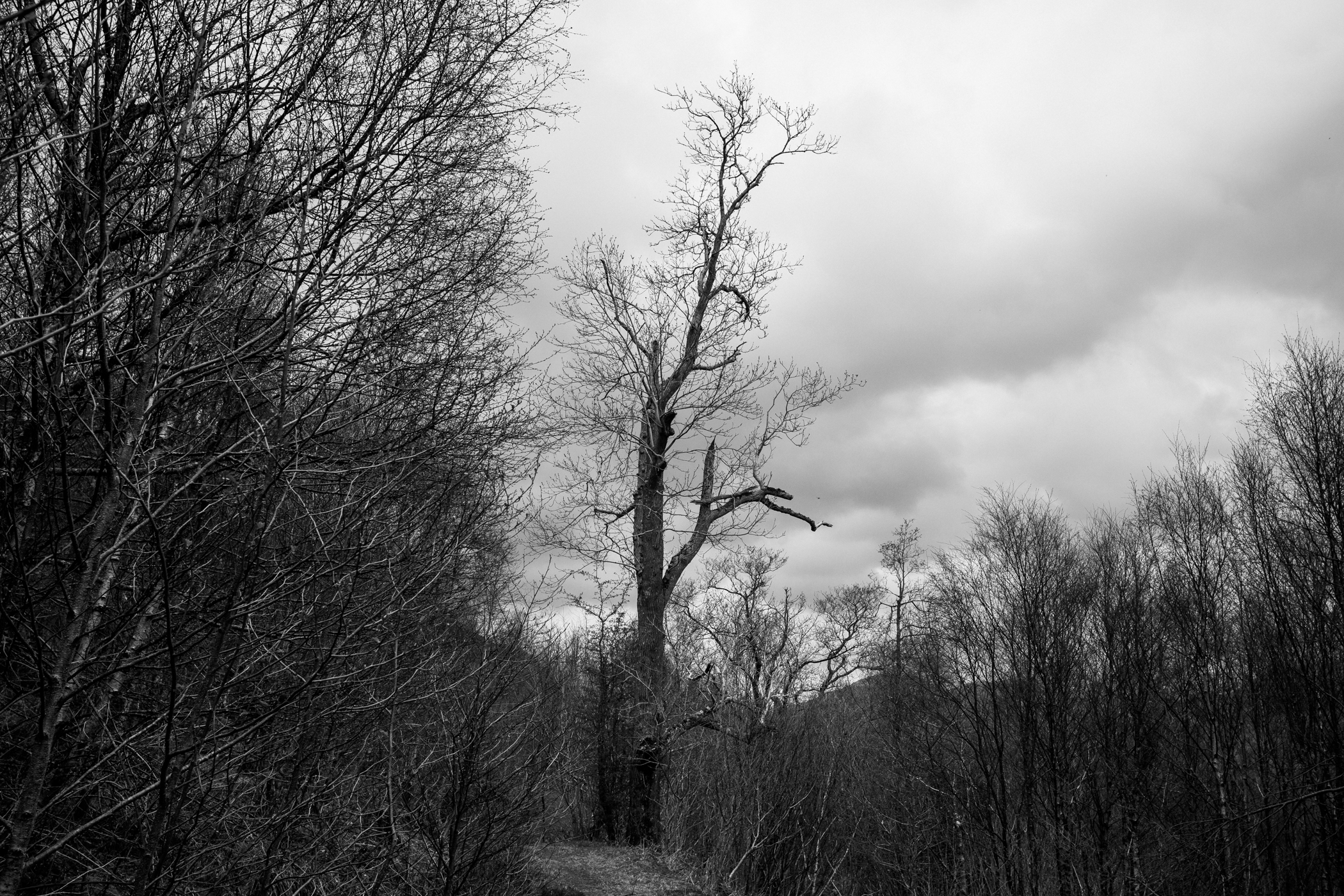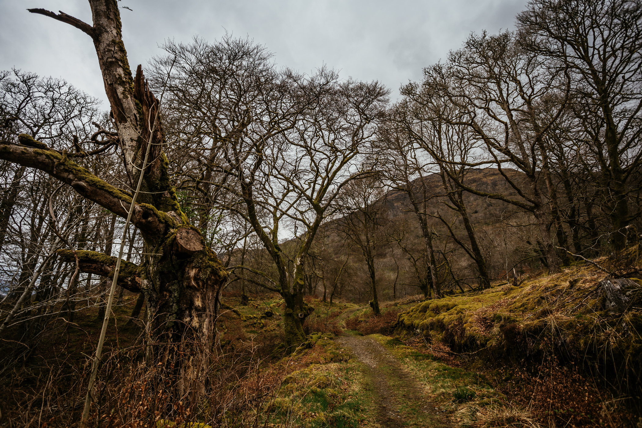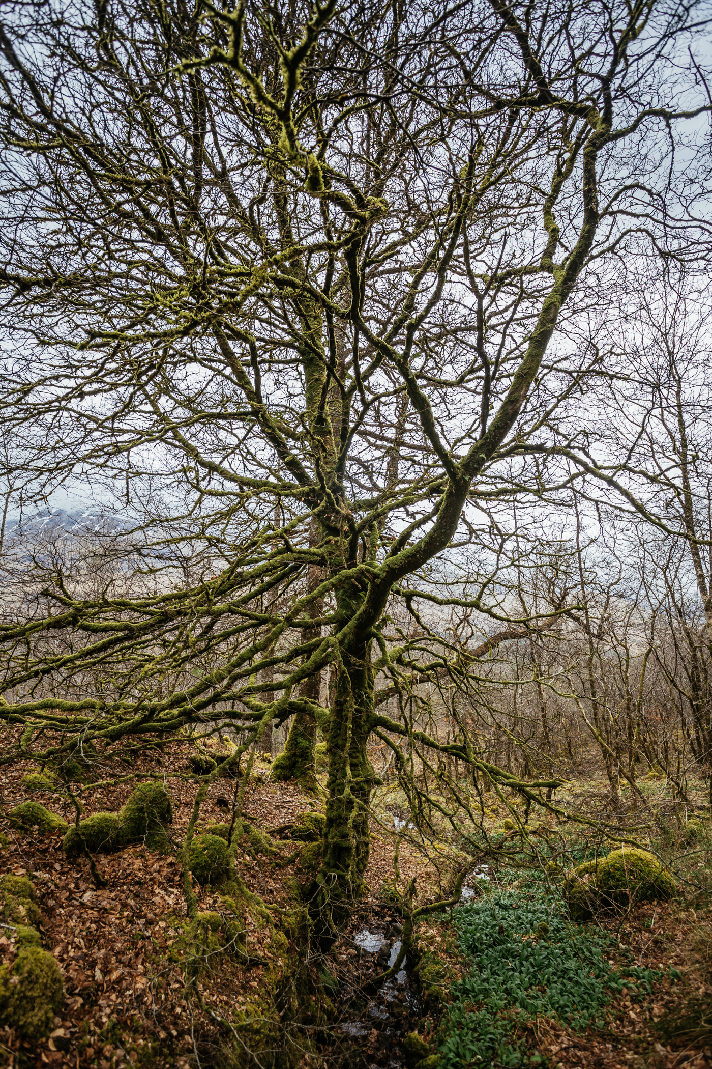 We spent a lot of time just sat near the bridge and taking it all in, after a while it was time to go. We made our way back to the main path and chose to go on the scenic path back, which we had hoped would give us amazing views down the valley! On the way we came to this tree, we think possibly that has been struck by lightning! It looked very impressive against the looming skies!