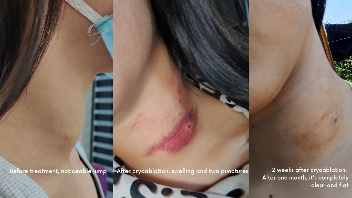My neck also looks flat now. Before the treatment, people would notice the lump on my neck because it was also swollen. The swelling is gone and there is no mark from the 2 punctures made.