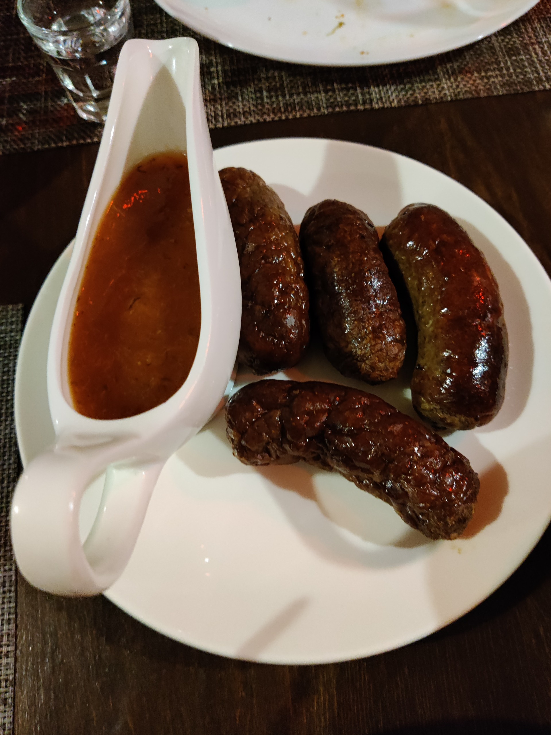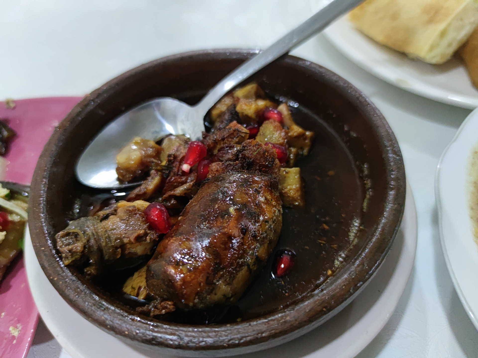 - Megrelian traditional sausage, claypan fried pork offal with pomegranate sauce