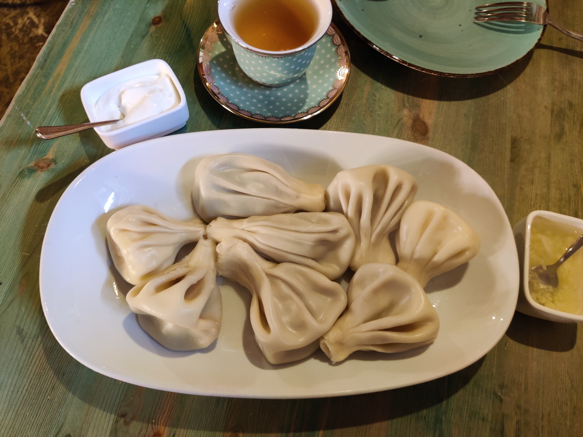 Khinkhali is a traditional Georgian dish that you shouldn't miss. It looks like oversized dumplings. It's eaten with the hand, you slurp the soup after the first bite and then you can enjoy the meat or vegetable filling. It's basically a dumpling soup.