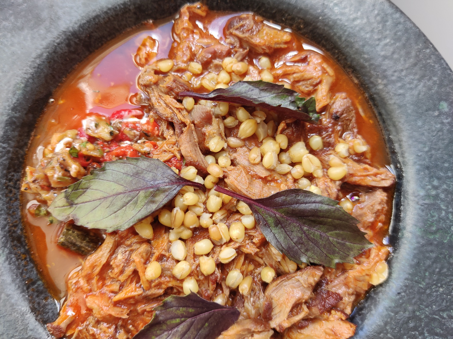 - Veal Chakindzuli - traditional Georgian meat stew in white wine with greens and sour plums