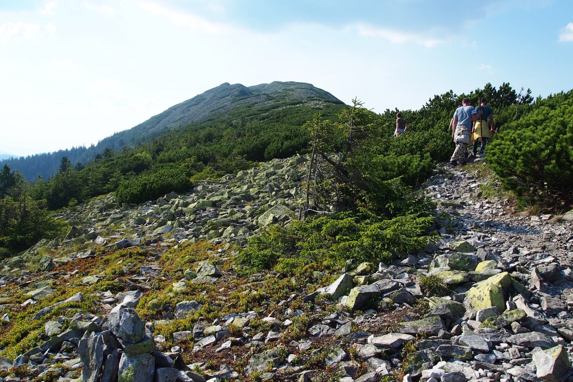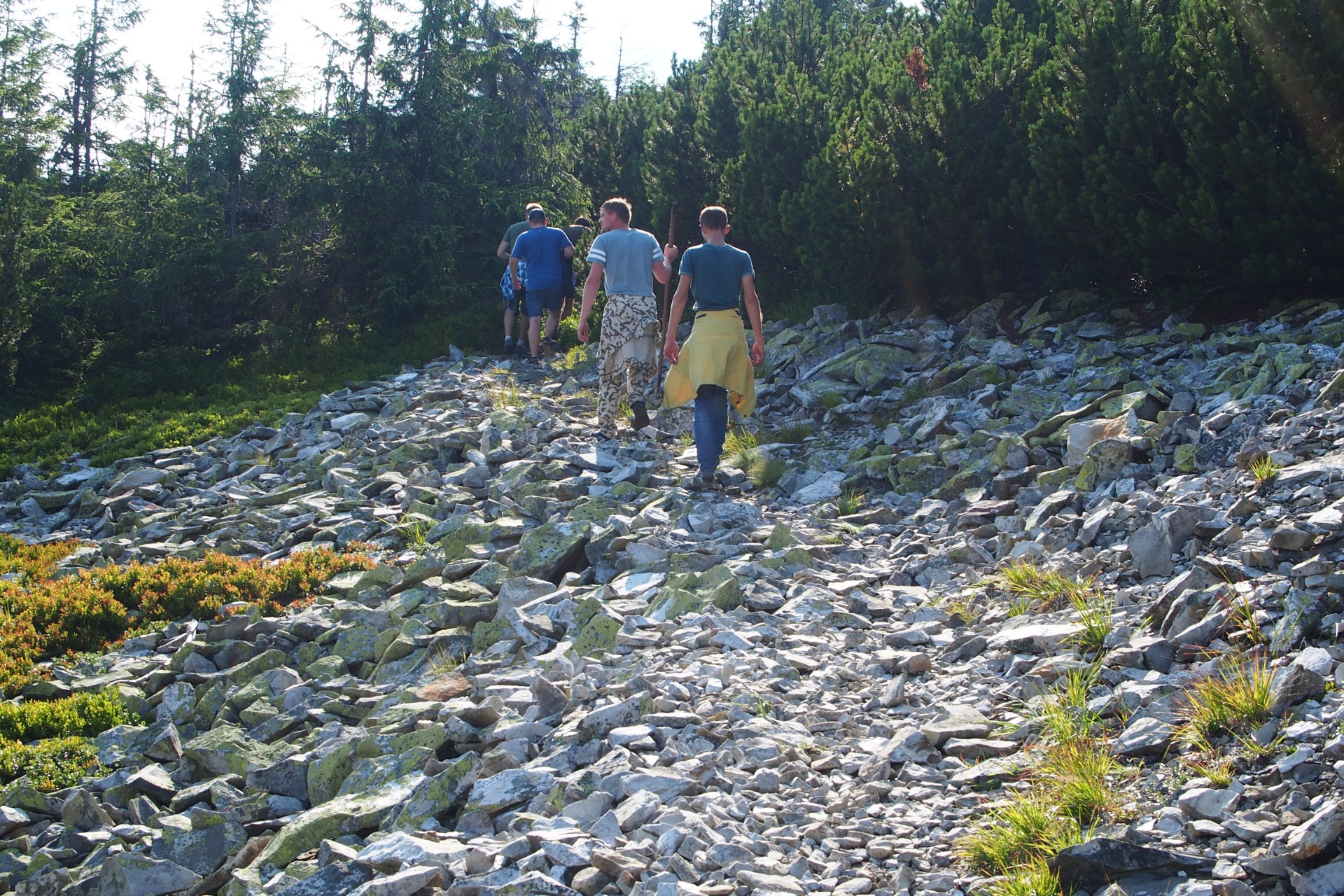 Low pine overgrowths are not continuous, they alternate with stone grounds. Our path wriggles between the piles of stones that the glacier once brought. It is very easy to break your legs here if you are careless. However, if you move your feet carefully, it is easy to walk, the stones are flat, smoothed over tens of thousands of years. From time to time I even had to jump from one block to another.