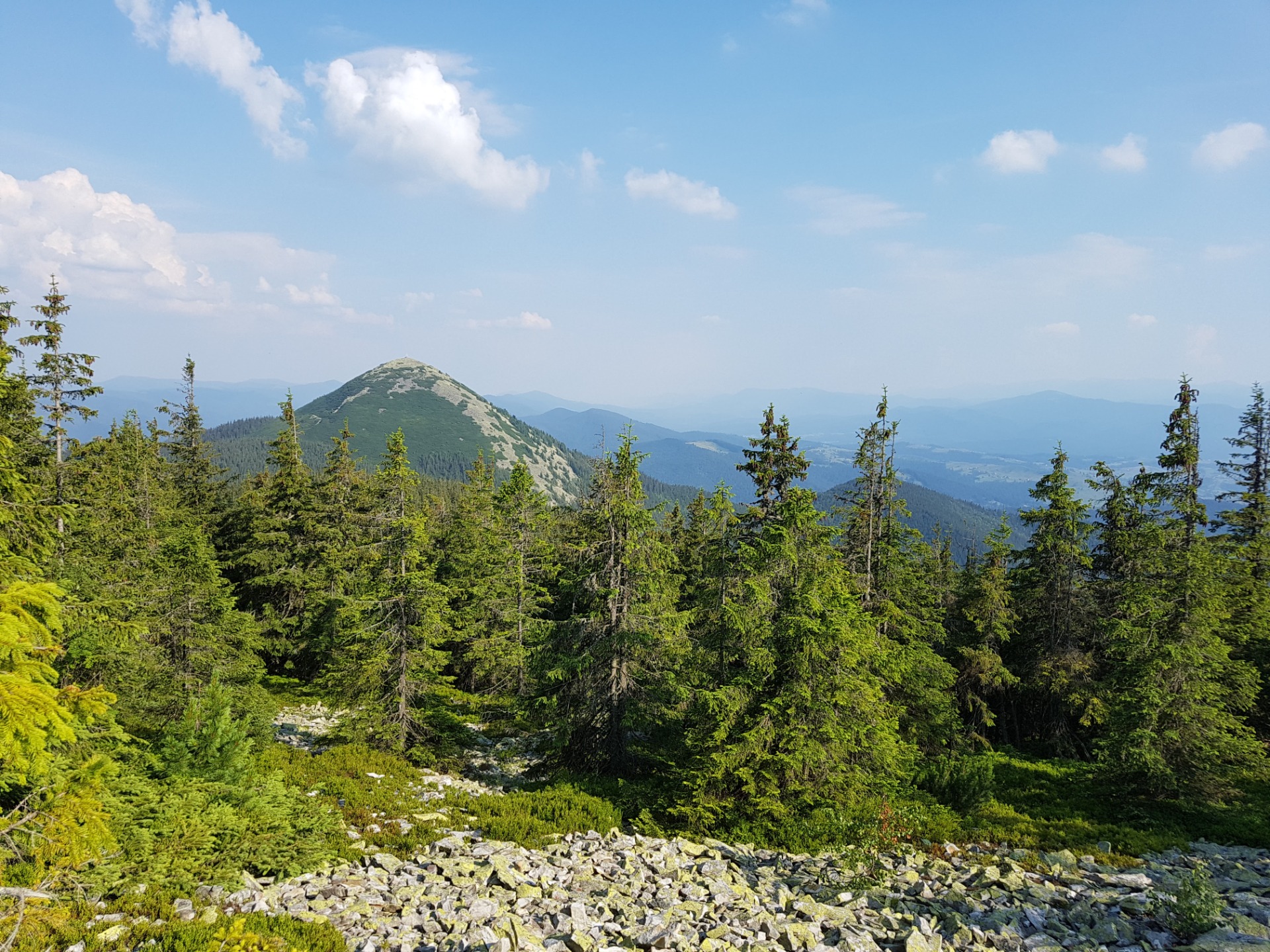 Looking back, you can see the Khomyak Mountain we are about to climb tomorrow. It seems to be very close, but in fact it is not, the mountain is a few kilometers away. And below, in the valley, you can see the popular ski resort Bukovel, where every winter I come to ski.