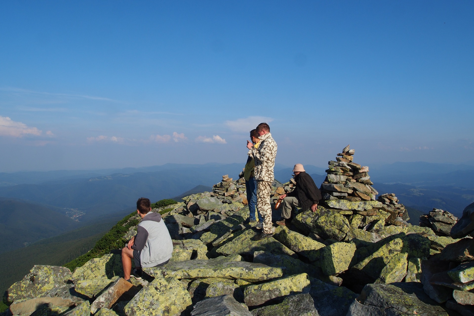At the top of the mountain are piles of stone, similar to the pyramids. They were formed because everyone who rises here puts at least one stone on the pile, and these chaotic-ordered structures have arisen. We also made a contribution, which made the height of the pyramid even higher by several centimeters.