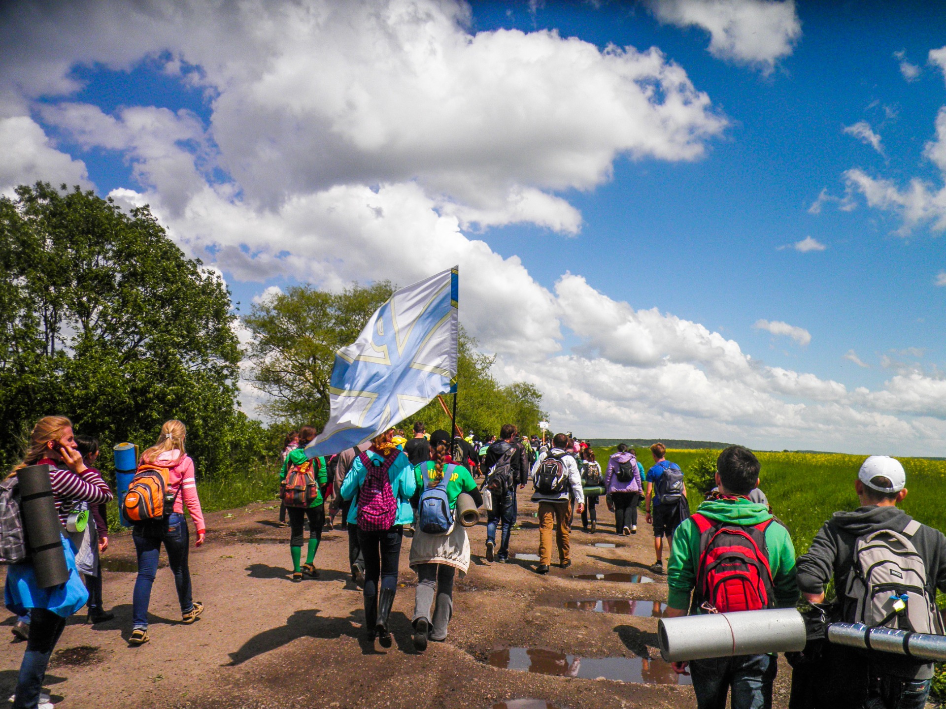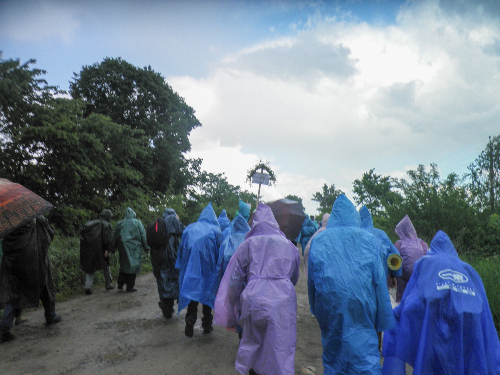 As we rested and moved on, the rain started, so we had to put on raincoats. The dirt road that several thousand people passed in front of us turned into a real swamp and it became a real challenge for our feet. But after the rain the sky became very clear, bright blue, so we took many beautiful photos.