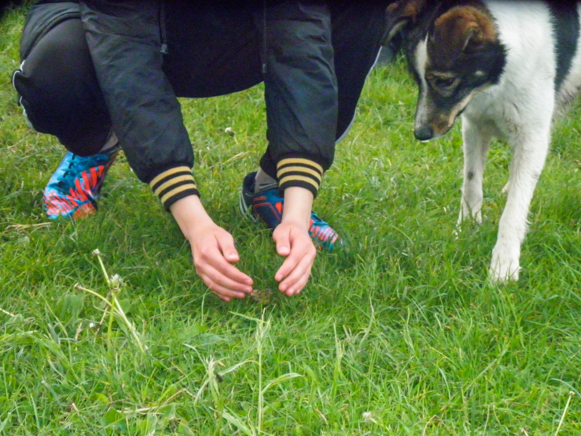 During the halt, my wife and I became friends with a rural dog. We treated him with cookies, and he also decided to thank us, so after running a little along the road, he started barking. It turned out that he found a small green frog in the grass. My wife and I laughed at this gift and let go of the frog.