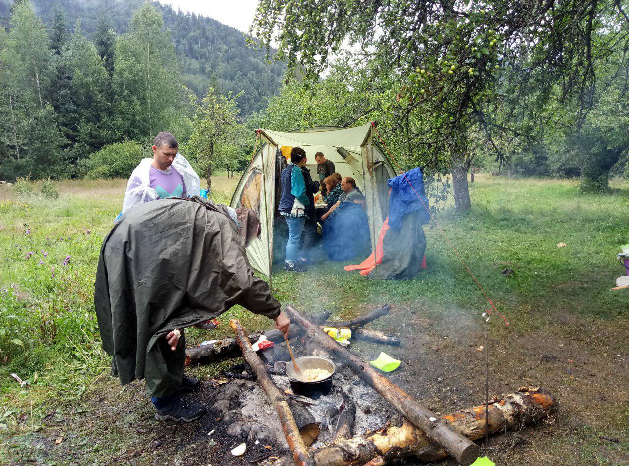 Now we can return to our camp. When we warmed up and dried our wet clothes, we decided to cook those mushrooms that did not require special heat treatment. Each of the participants in our hike gave away russulas, chanterelles and young porcini mushrooms to prepare a joint meal. We cleaned all the mushrooms from dirt and soil, washed them several times (there was a river with clear mountain water next to them), fried these mushrooms in a cauldron together with chopped onions. When the excess moisture evaporated from the mushrooms, we added sour cream, salt and pepper to taste and braised it until done. We got a delicious meal that smelled like smoke from the fire. And, I also forgot to say that the rain did not stop and continued to fall, so we cooked our mushrooms in the rain. And we ate this dish in a big tent where we all fit in. We were a little tight, but at the same time very fun. It was a wonderful journey and an incredible adventure!